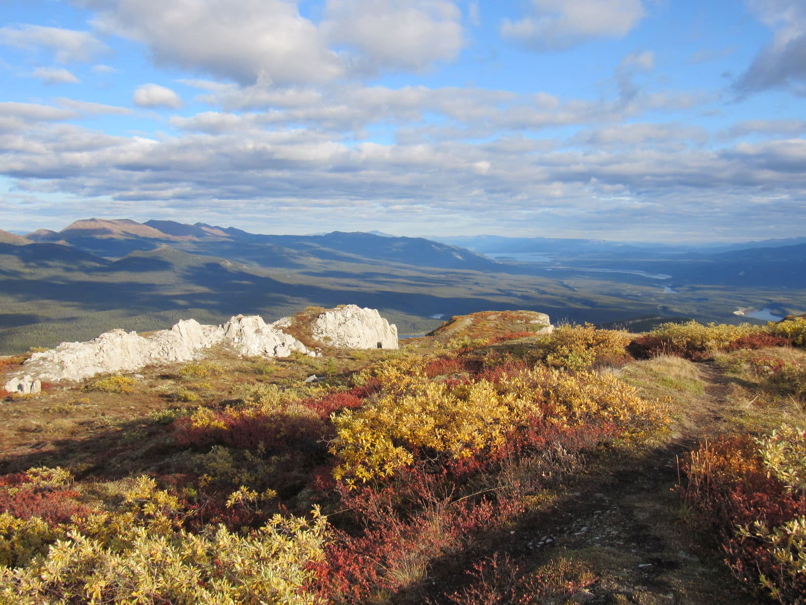 The trail started off passing through stands of aspens that had already lost most of their leaves. Lupe was soon past the trees out on open ground. She hadn’t gained much elevation yet, but Carcross and the N end of Bennett Lake were already in sight beyond Nares Lake.