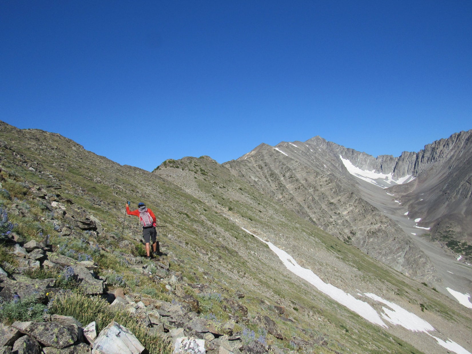 Even before the ridge became really rocky, SPHP was having a hard time keeping up with Jobe. Lupe could easily enough, but the effects of the climbs of the past 2 days, and Lupe’s long adventures earlier in the Wind River Range were taking a toll on SPHP. Though Jobe repeatedly stopped and waited, or went slowly for him, SPHP was falling farther and farther behind.