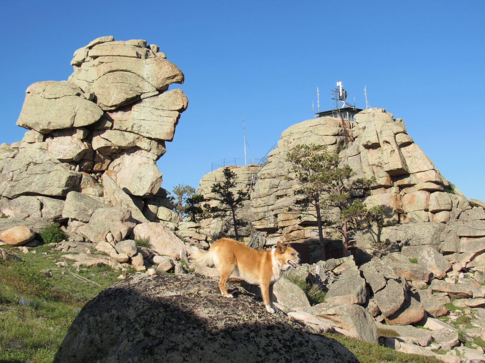 SW of the lookout tower were some great viewpoints where Laramie Peak was on display. Lupe took a little time to sniff around and explore this area.