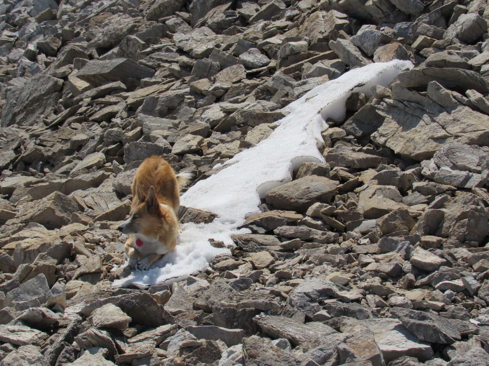 At first, all was well.  The stroll along the ridgeline was easy.  Lupe made great progress.  She even found a delightful patch of snow.
