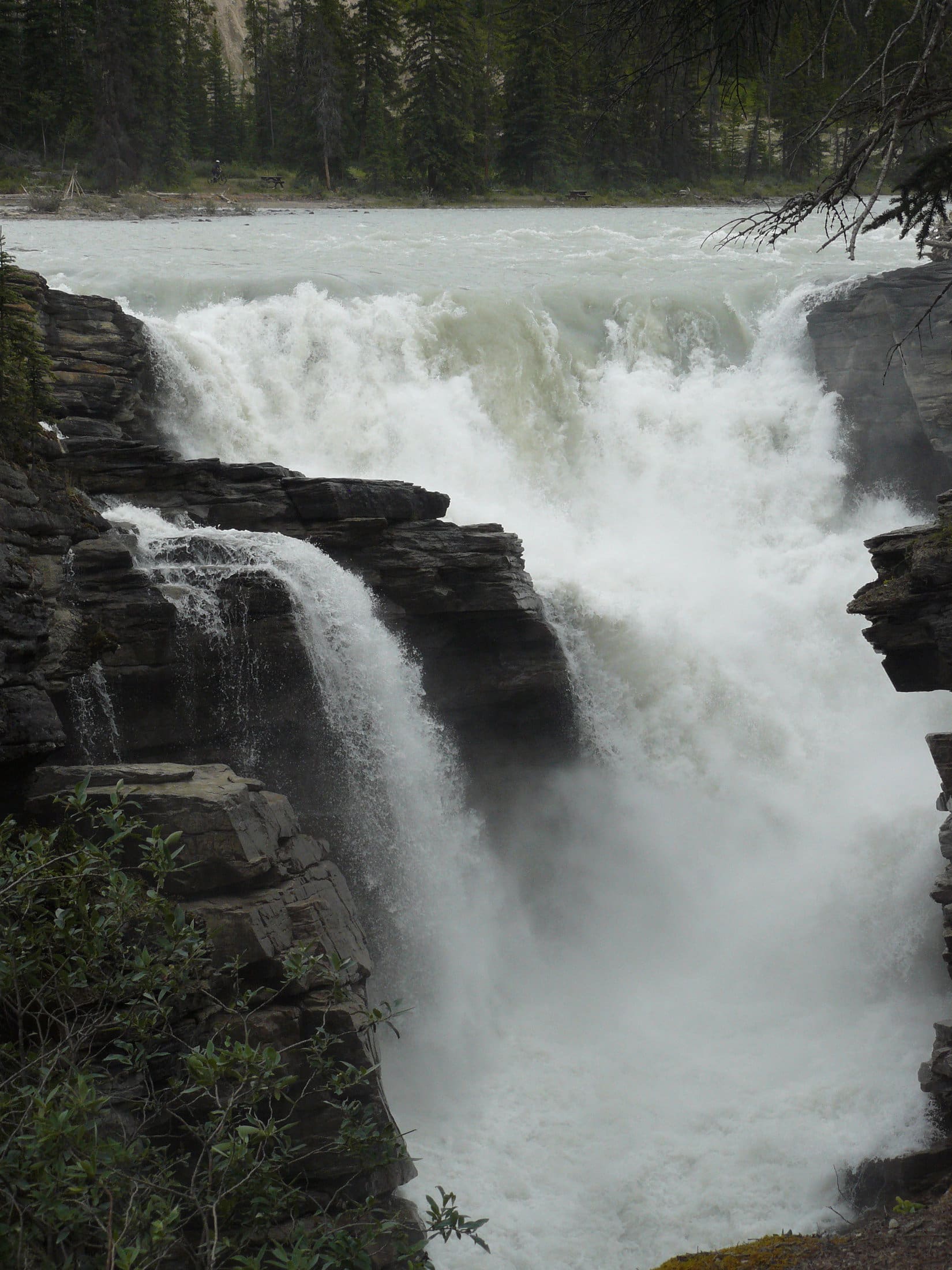 After lunch, it was only 5 or 6 miles farther N on the Icefields Parkway Hwy 93 to a left turn onto Hwy 93A, which very shortly leads to parking lots for the mighty Athabasca Falls. By this point, the Sunwapta River has joined the Athabasca. The flow of water over Athabasca Falls is tremendous and powerful.
