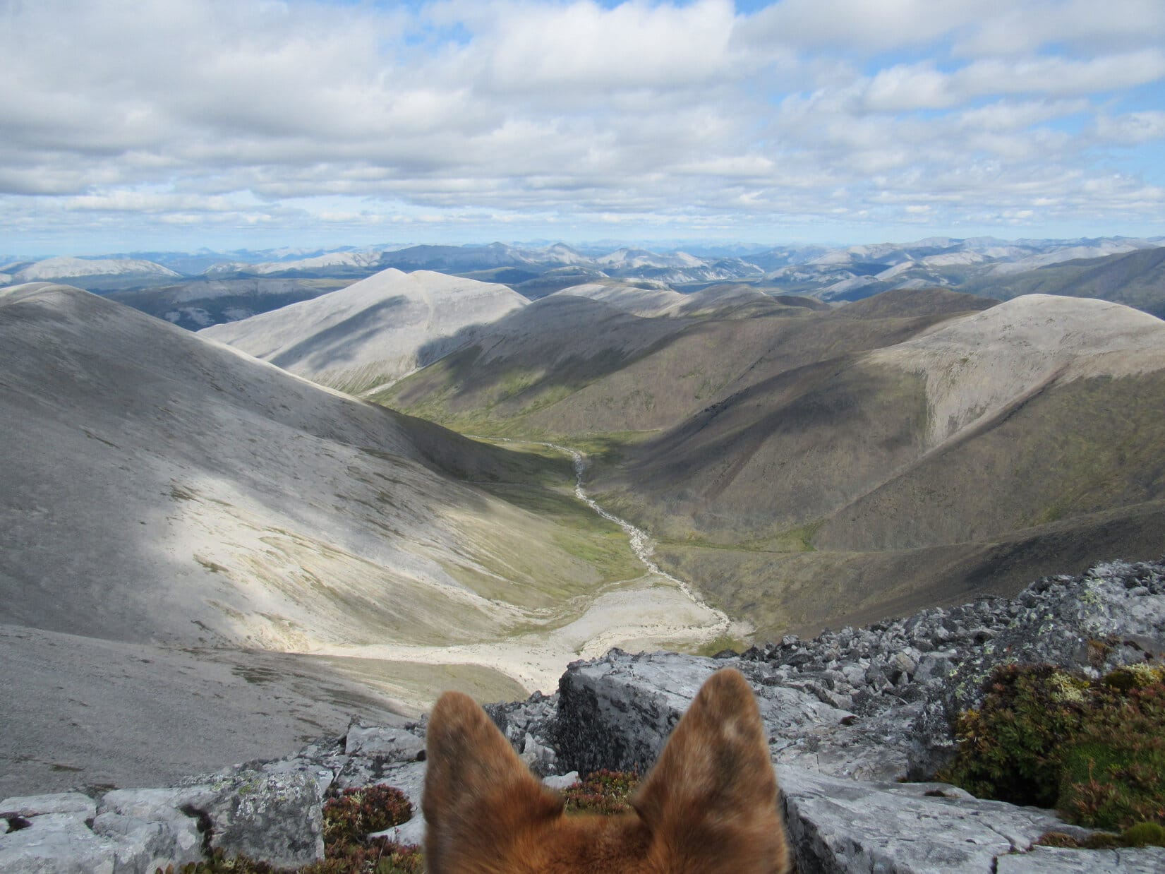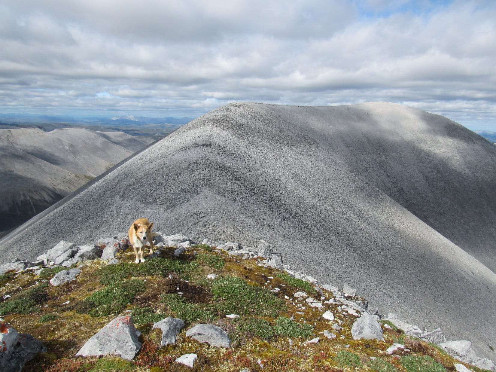 Lupe stood near the cairn. This was a dream come true! Windy Pass Peak, Distincta Peak, and now even Peak 5906 – way up here in the Yukon, N of Tombstone Territorial Park, the Carolina Dog had actually made it to them all! An undeniable moment of joy and glory.
