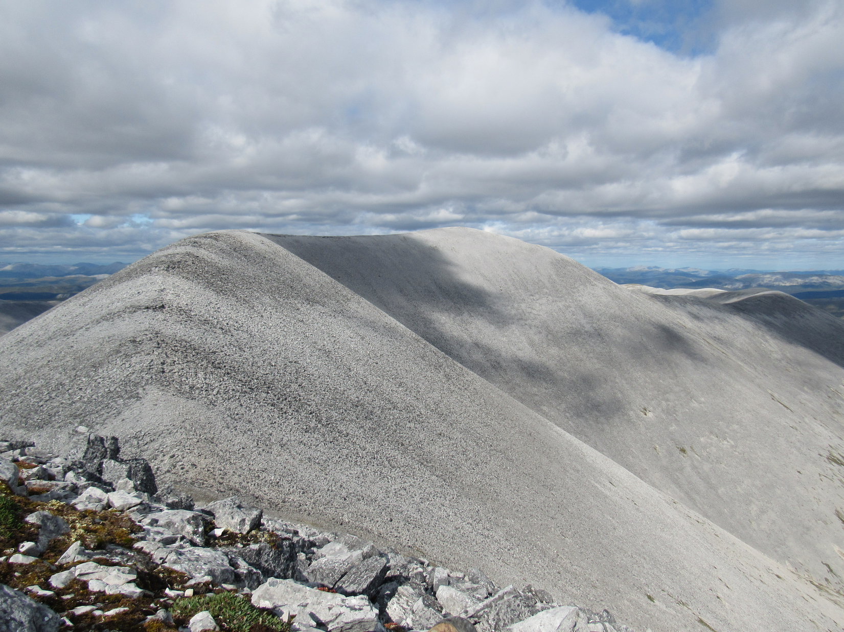 In a pale blue Yukon sky, cotton ball clouds sailed overhead. Facing N, Windy Pass was out of sight beyond a curve in the valley below, but both summits of Windy Pass Peak (5,249 ft.) were in view. Nearly the entire long ridge route Lupe had taken to get here was, too. Remote, unspoiled mountains stretched away to the horizon. Few appeared to be as high as Distincta Peak where Lupe was right now.