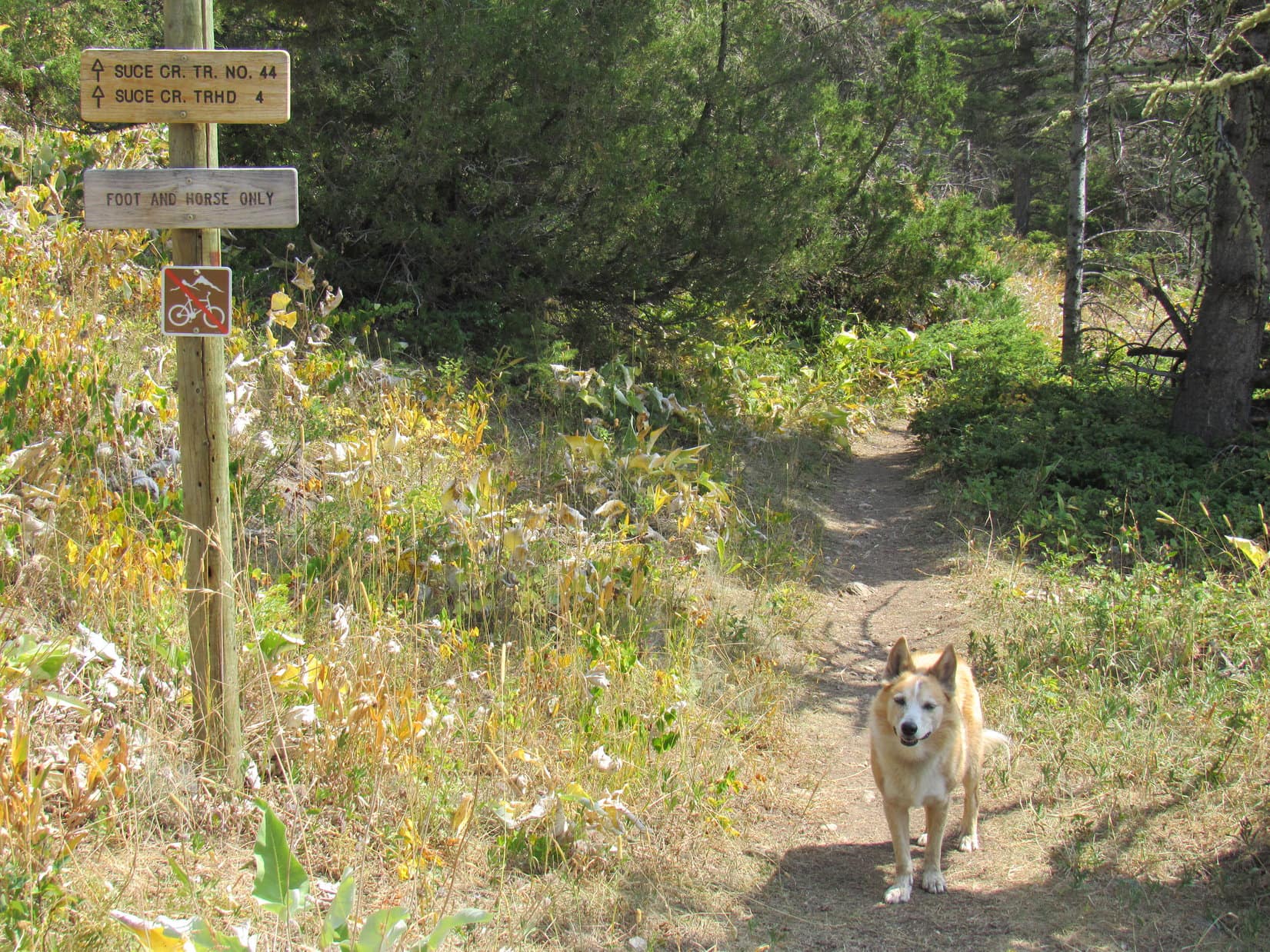 Heading SE, Lupe crossed a meadow. The trail then curved N, climbing into a region of tall bushes. Loop gained 100 feet of elevation before the trail leveled out. Here a junction appeared on the R with North Deep Creek trail No. 45, but the American Dingo ignored it and went on.