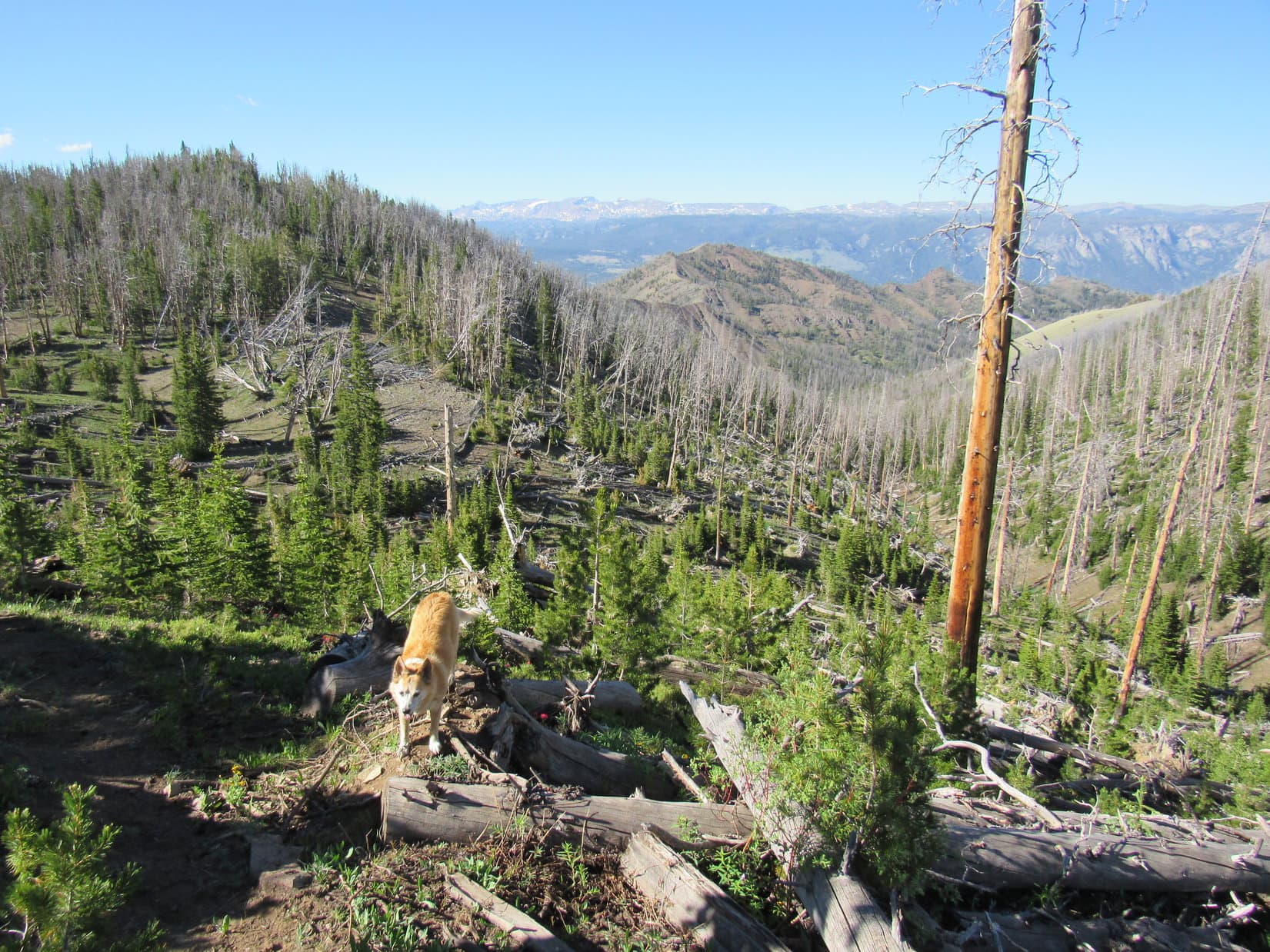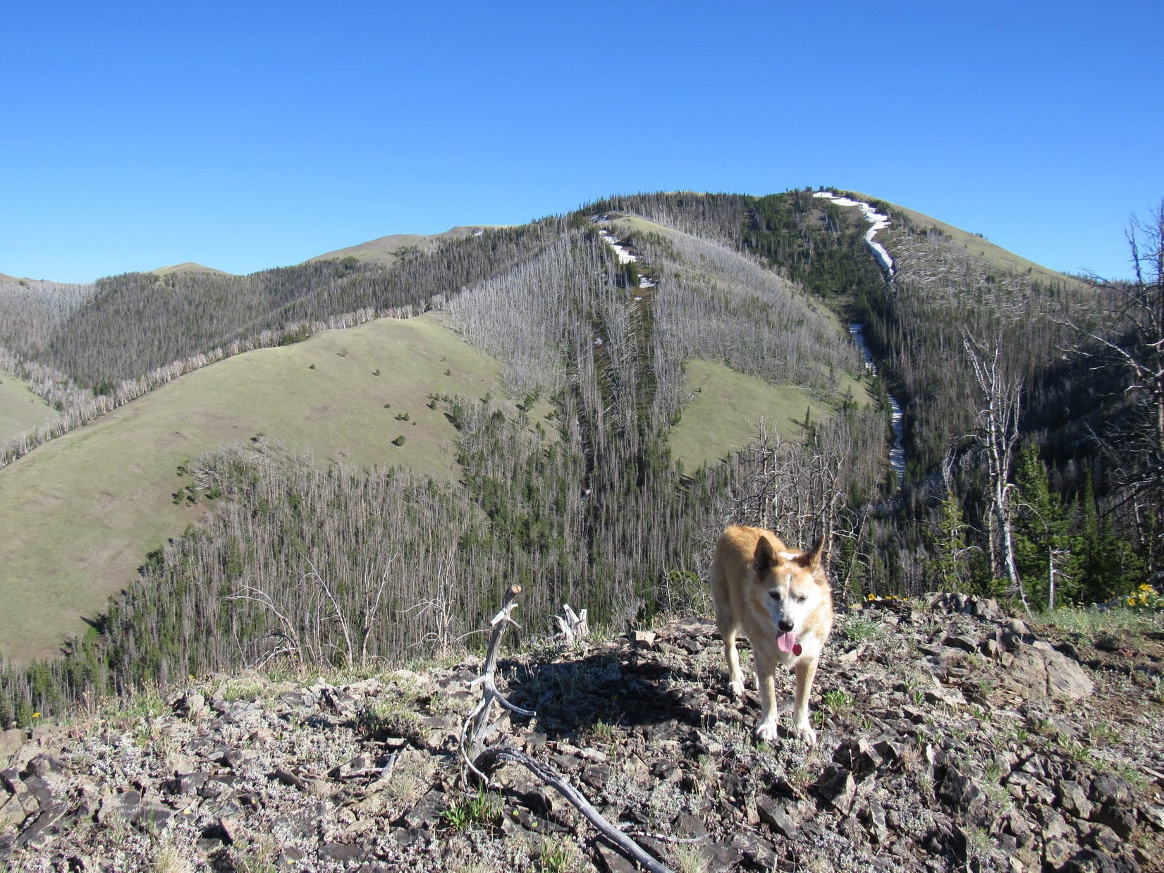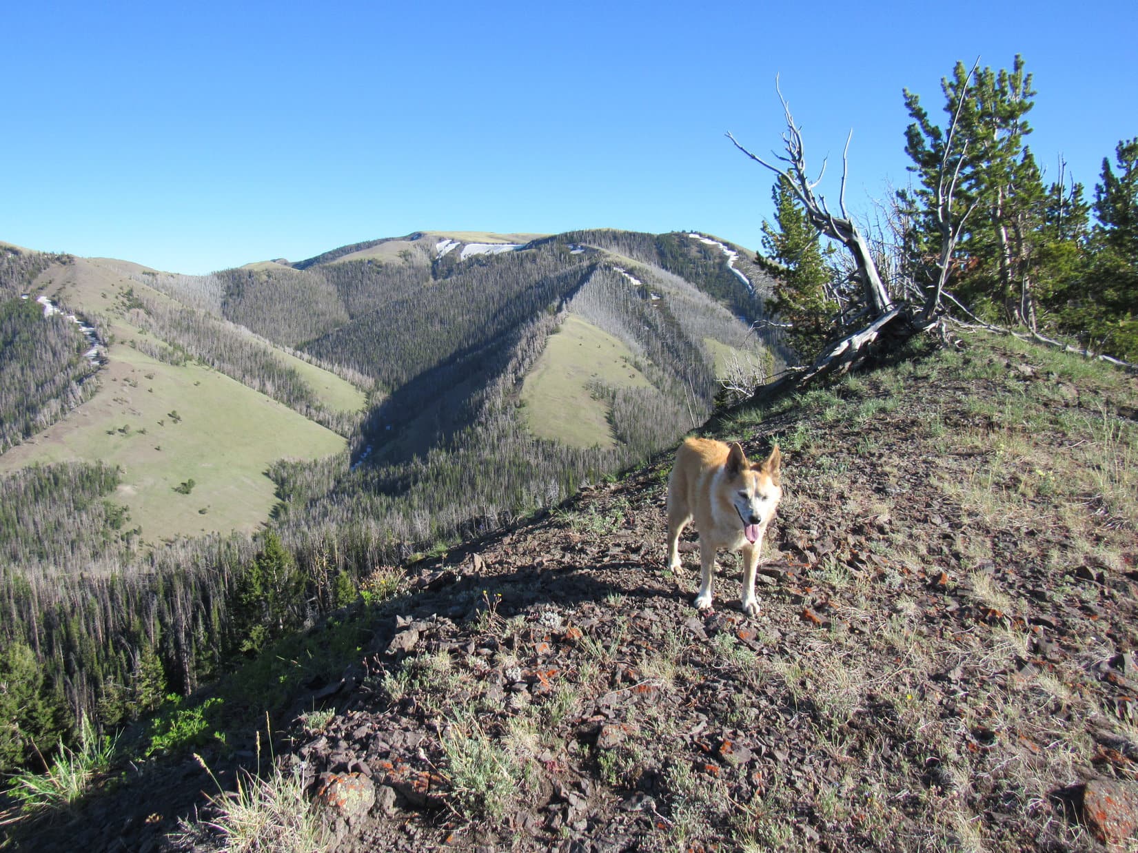 So much to see!  Mountain glory in all directions, but time waits for no Dingo.  75 minutes after arriving, Lupe stood again near the old wooden cross, the mighty Beartooths of Montana arrayed far beyond her.  A final look, and the inevitable descent began.