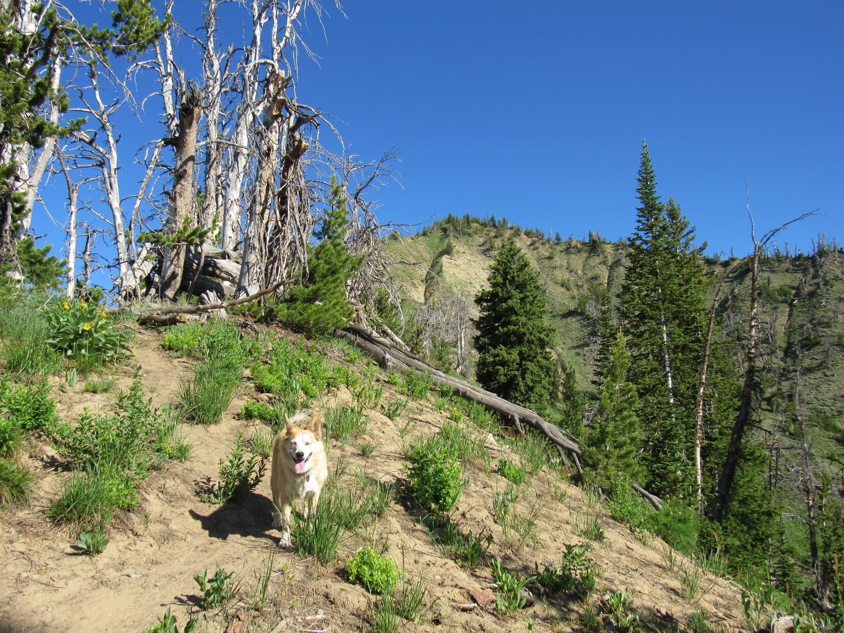 The climb was fairly steep from almost the very start. Looper roamed a forest that was sunnier and more open than expected, passing lots of big yellow wildflowers growing in clearings. Although many trees in this forest were dead, nearly all were still standing.