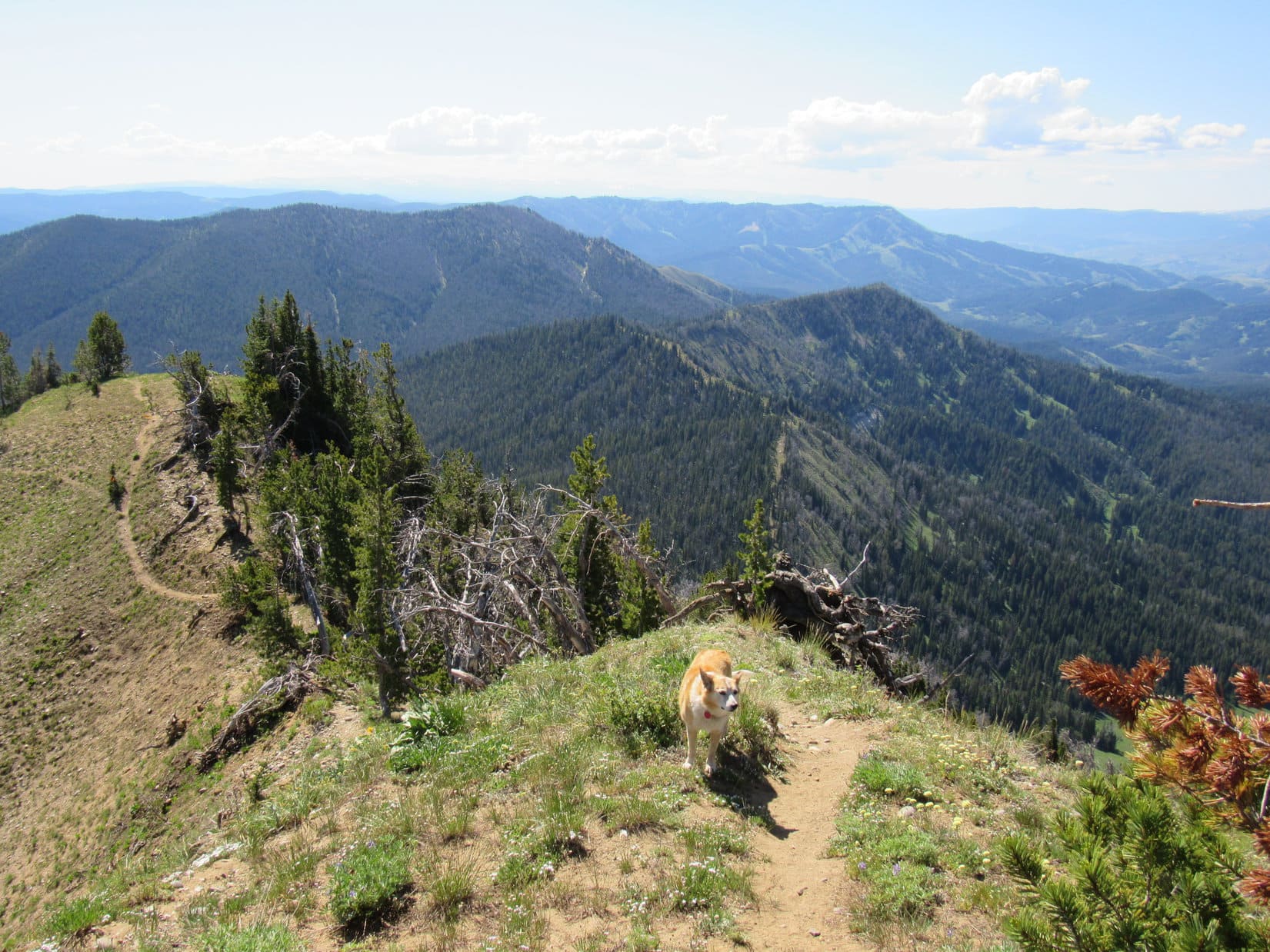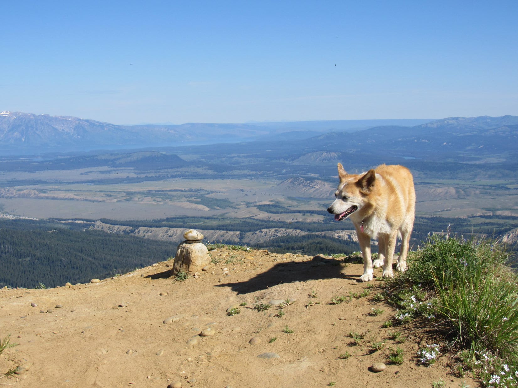 Cloudy only near the horizons, Mount Leidy (10,326 ft.) was baking in the early July sun. Warm alright, and with scarcely a breeze. Actually felt pretty comfortable to SPHP, but Lupe was hot. She quickly sought out the shade of a few small trees or bushes along the summit’s edge.