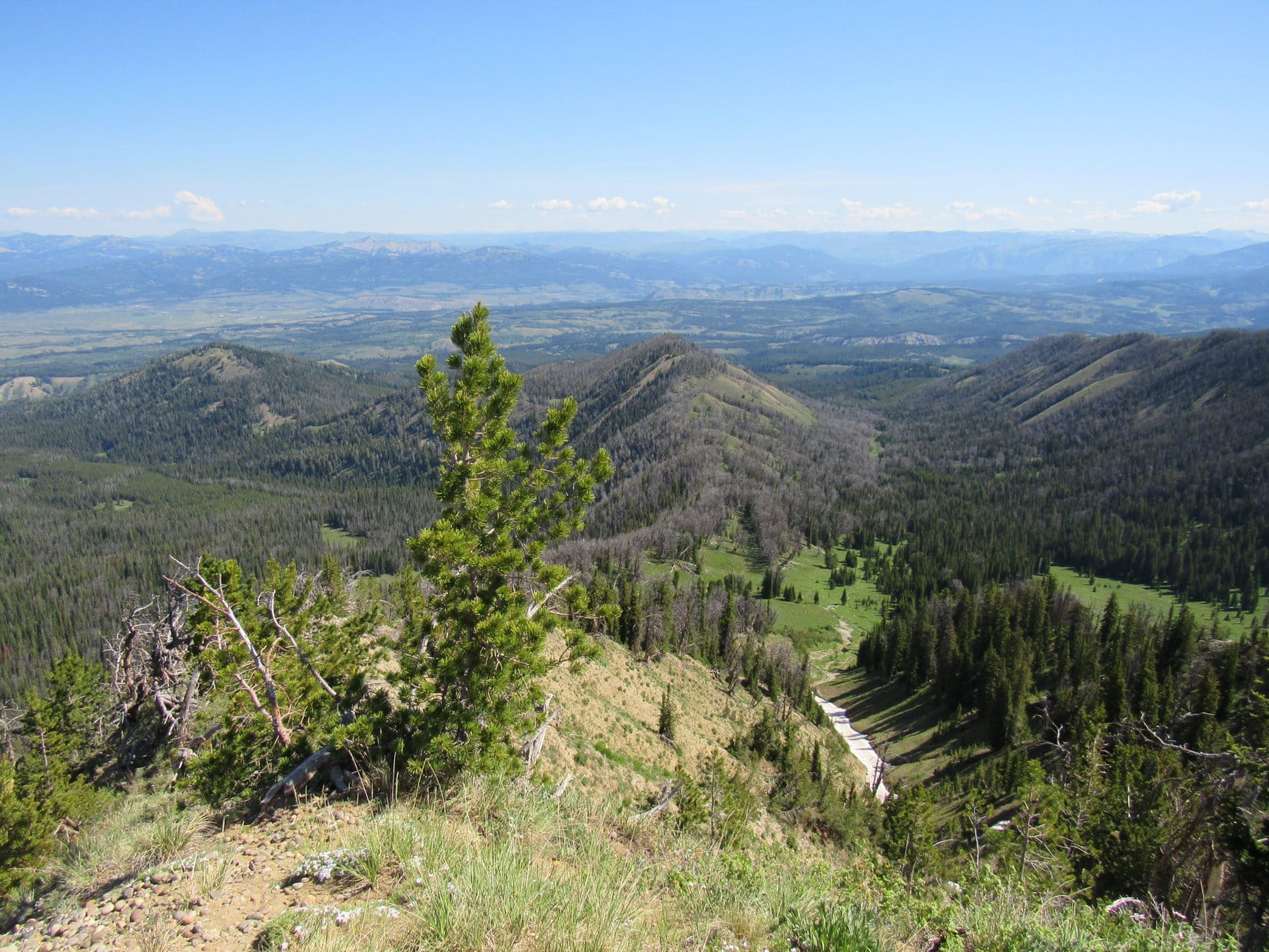 Water and a shared chocolate coconut bar. SPHP had a fruit cup, too. The views were tremendous, although the air was sort of hazy. Smoke? Humidity? Hard to say, but it seemed more like smoke. Far to the SE, the Wind River Range was scarcely discernable.