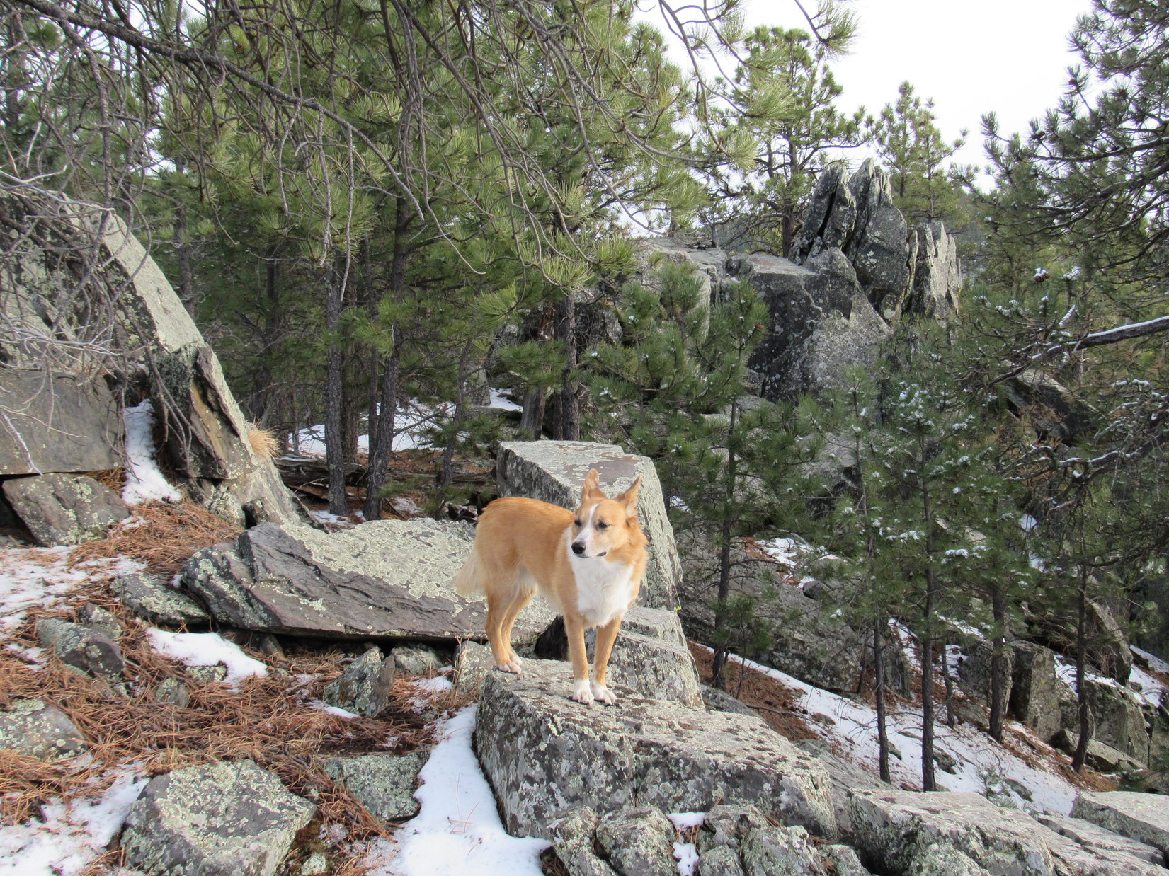 Lupe lost a little elevation continuing S from the summit of Bluelead Mountain. As the ground leveled out, she reached the edge of a small clearing in the forest. Lupe stopped. There was something right out in the open on the other side of the clearing, something Lupe had never ever seen before in 158 prior Black Hills expeditions, or on any of her Dingo Vacations either.