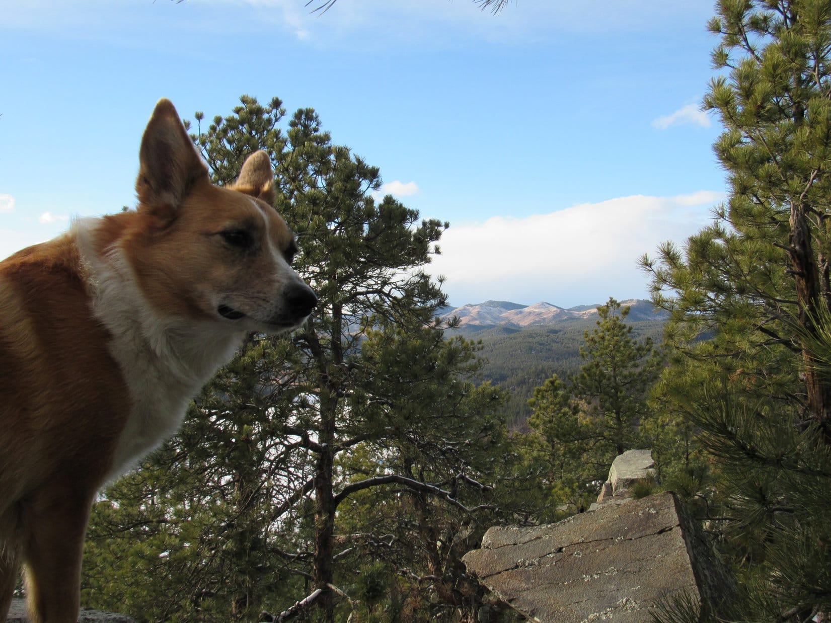 Bluelead Mountain is very thickly forested with Ponderosa pines. Even though Bluelead Mountain is right next to Sheridan Lake, the lake could hardly be seen. After a short steep stretch, Lupe came to parts of the dense forest that were nearly level. She had a great time prowling around being a ferocious Carolina Dog.