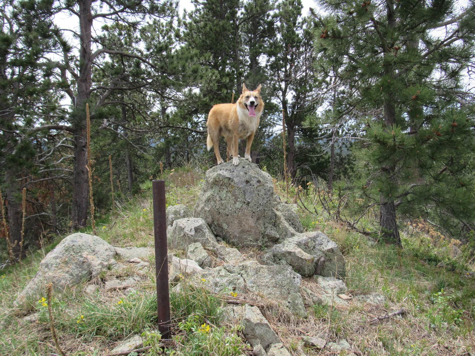 The Carolina Dog soon arrived at the top of Sugarloaf Mountain (6,037 ft.).  The summit area was a narrow ridge maybe 50 feet long running N/S.  A big rock toward the N end was clearly the highest point on the mountain.  A few feet N of it, a 3″ diameter pipe stuck up several feet out of the ground.  Lupe hopped up on the summit rock to complete her ascent.