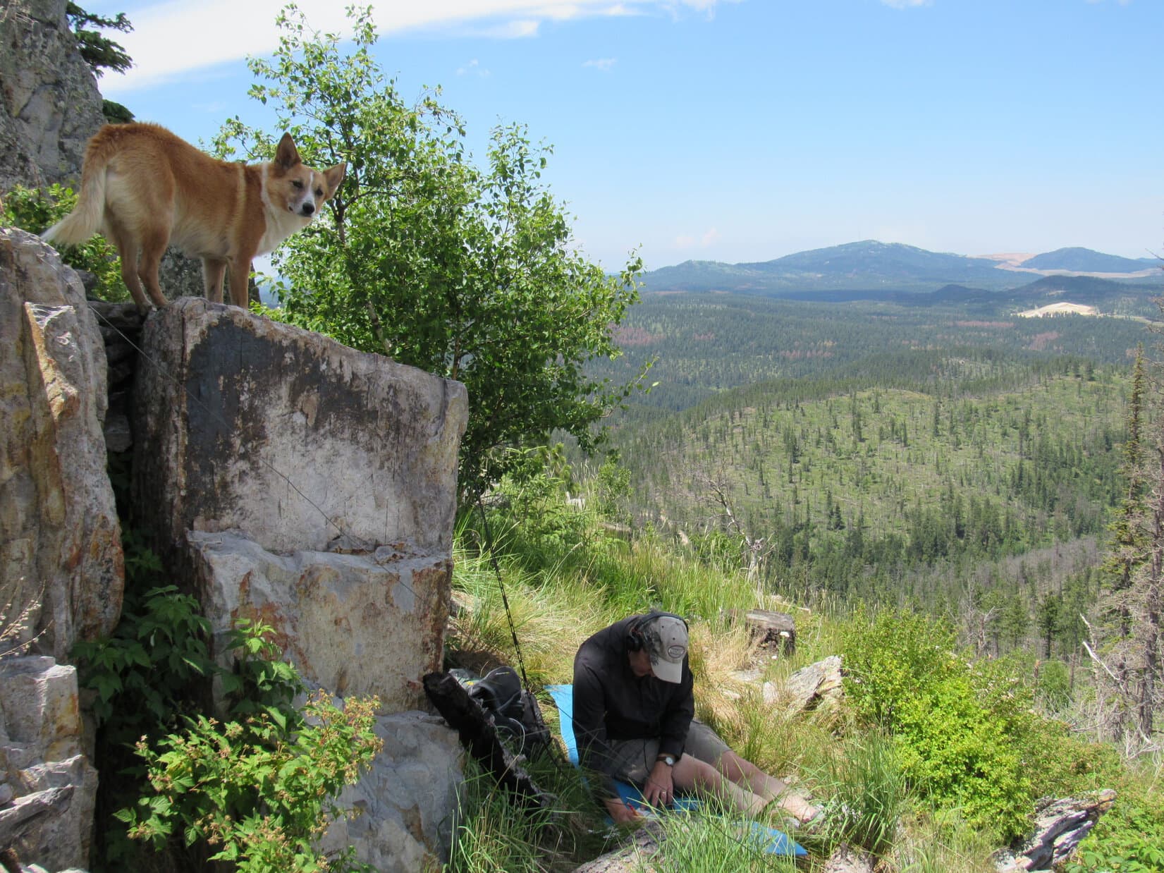 While Lupe looks on, Joe is instantly swamped by the response to his Summits on the Air activation of Custer Peak! Terry Peak (7,064 ft.) (R of Center) is the highest mountain in the distance. Photo looks NW.