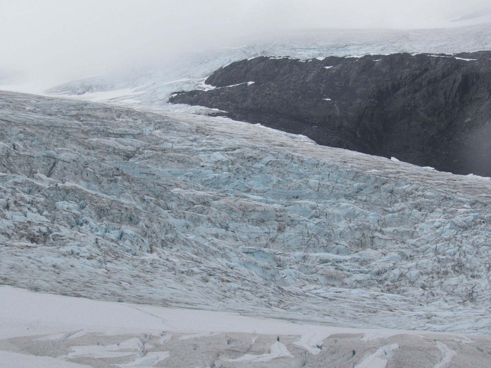 Lupe reached the end of how far she could go W. The view was stupendous, even on a cloudy, drizzly day. Beneath the misty clouds, the sense of grandeur, solitude, and isolation was supreme. Snow, ice, mist, and dark rocks comprised the whole visible world.