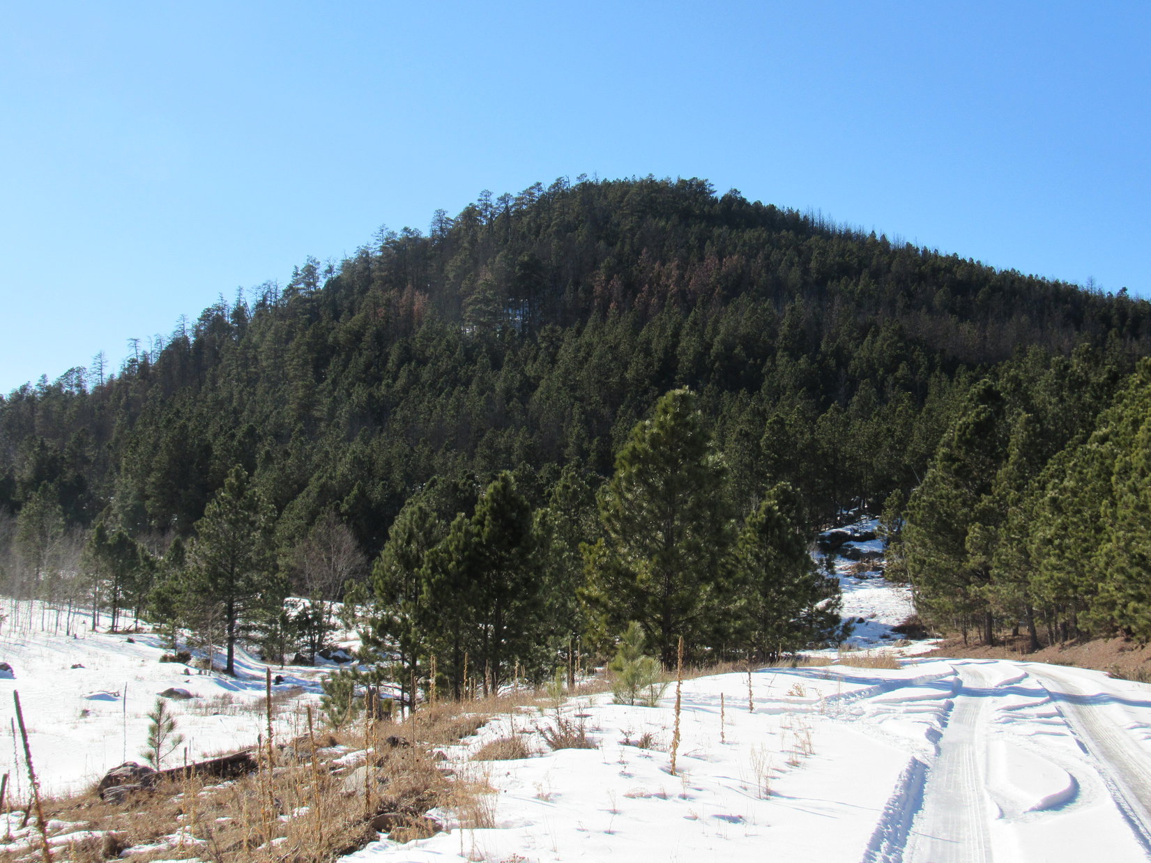 Lupe followed No. 337 going SSW for 1.5 miles, passing to the W of both Kruger and Daisy Peaks. The road was snow-packed and quite slippery. Even Lupe skidded around on some wet, icy spots. However, there was no traffic at all, and the road was an otherwise easy stroll. Lupe gained elevation along the way, but very slowly.