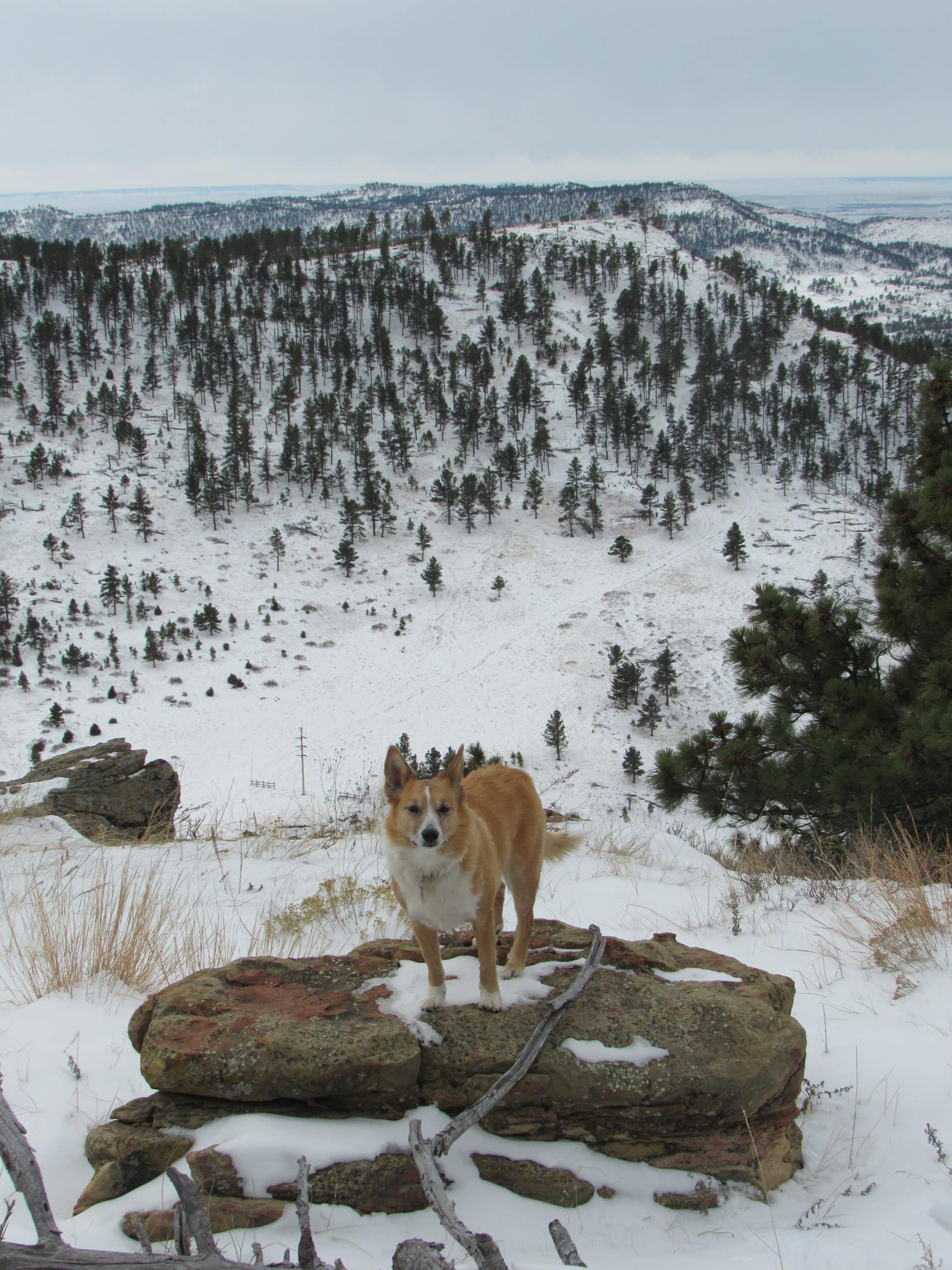 After a few minutes resting quietly, Lupe tensed up. Off to the NE, a herd of deer was running through the snow. Although quite a distance away, the deer were of keen interest to the Carolina Dog. Lupe watched excitedly until the last deer disappeared into the forest.