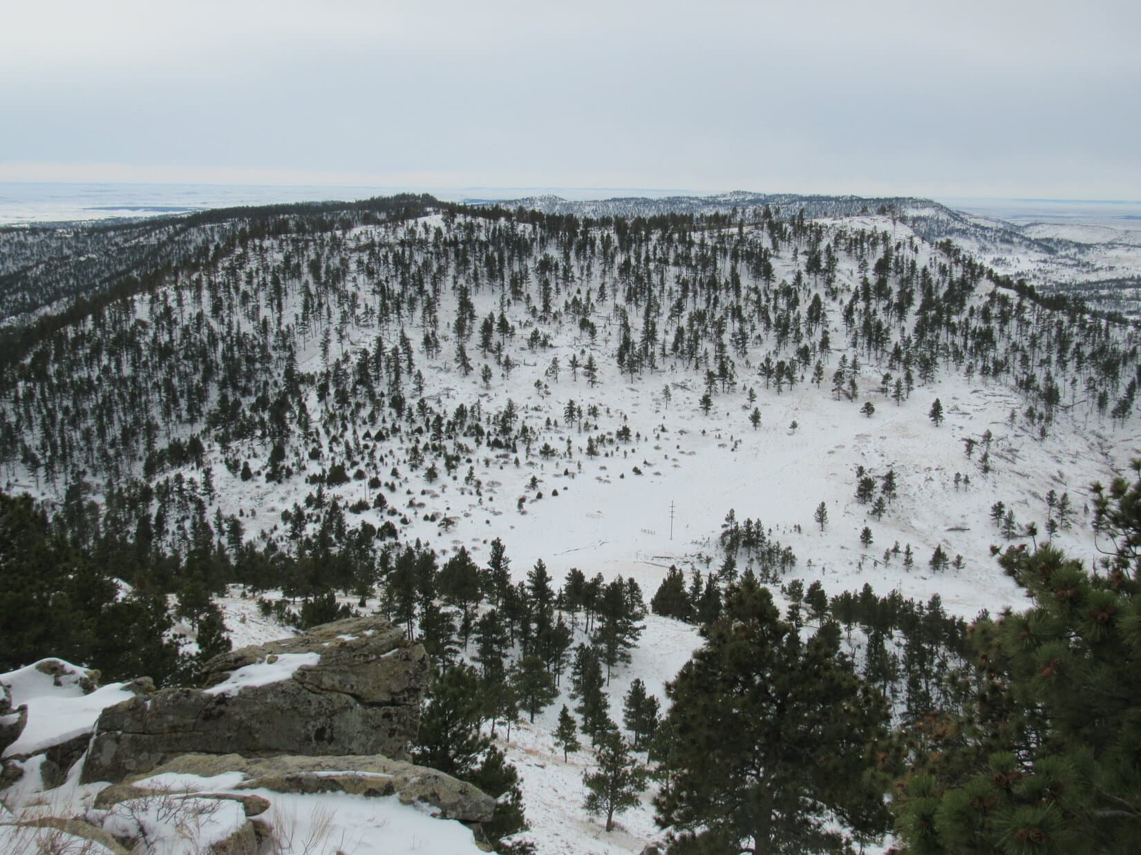 Disappointed by the lack of squirrels, Lupe continued S near the W rim of the mountain. Grand open vistas were on display to the SW. Under the overcast sky, the snow made the scene look clean and white, remote and desolate. What a great place to be! Off to the E, South Knapple Canyon was in view.