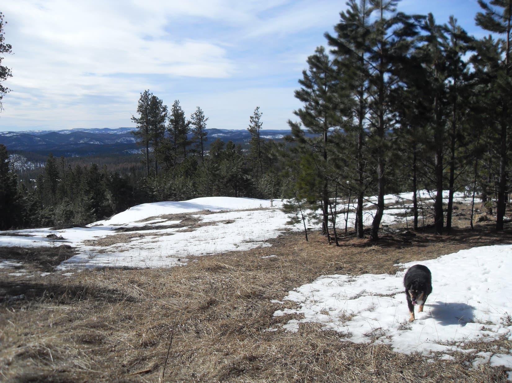 After 3 weeks of very cold weather, suddenly the forecast was for 70°F! Lupe couldn’t have been happier. An expedition was in the works! Lupe ran over to Dog Heaven and got permission for her buddy, Sidney, to come along, too. Big Sid was equally thrilled with this turn of events. It had been nearly 3 months since the last time he’d joined Lupe on Expedition No. 72 back on her 3rd birthday in December. This would be his 7th Black Hills expedition with her.
