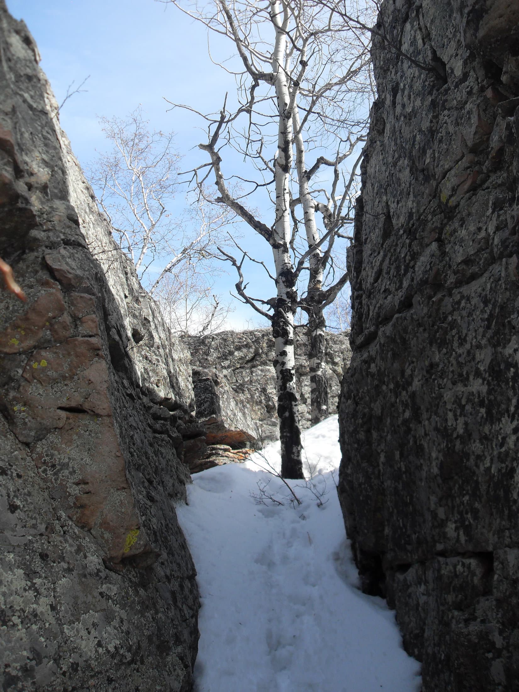 SPHP expected the ledge to slowly sink back into the easier surrounding terrain. Instead, the ledge became even higher. 20 foot cliffs were on both sides. Deep fissures in the rocks, combined with snow and small trees growing up in the cracks made traversing the ledge slow and tricky. At a particularly wide crack in the rocks, Lupe and Sidney finally found a way down through a 40 foot long passage.