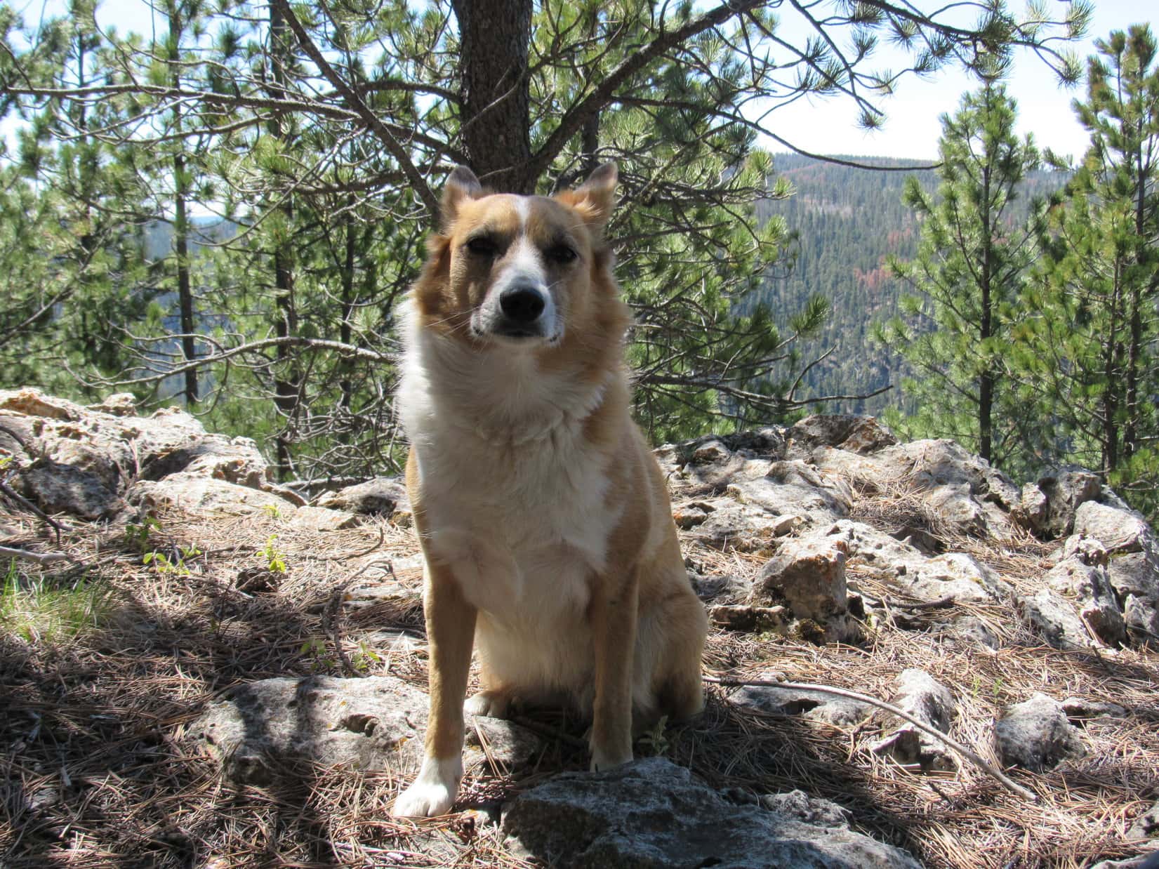 Lupe and SPHP took another rest break up on Elk Mountain.  SPHP had an apple.  Lupe had Taste of the Wild.  Water for all, of course.  Lupe shared a peanut butter granola bar with SPHP.  American Dingoes love granola bars!