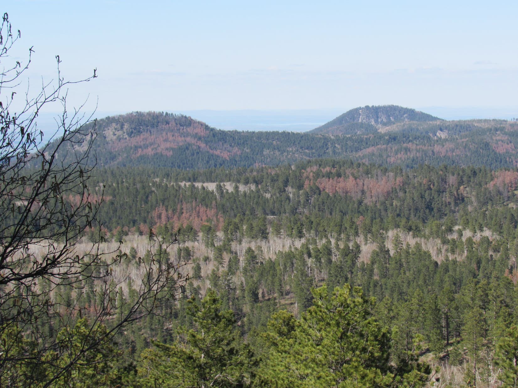 Forest generally hid the views to the N, but SPHP caught this glimpse between the trees of Crow Peak (5,787 ft.) (L) W of Spearfish, SD. Photo looks N.