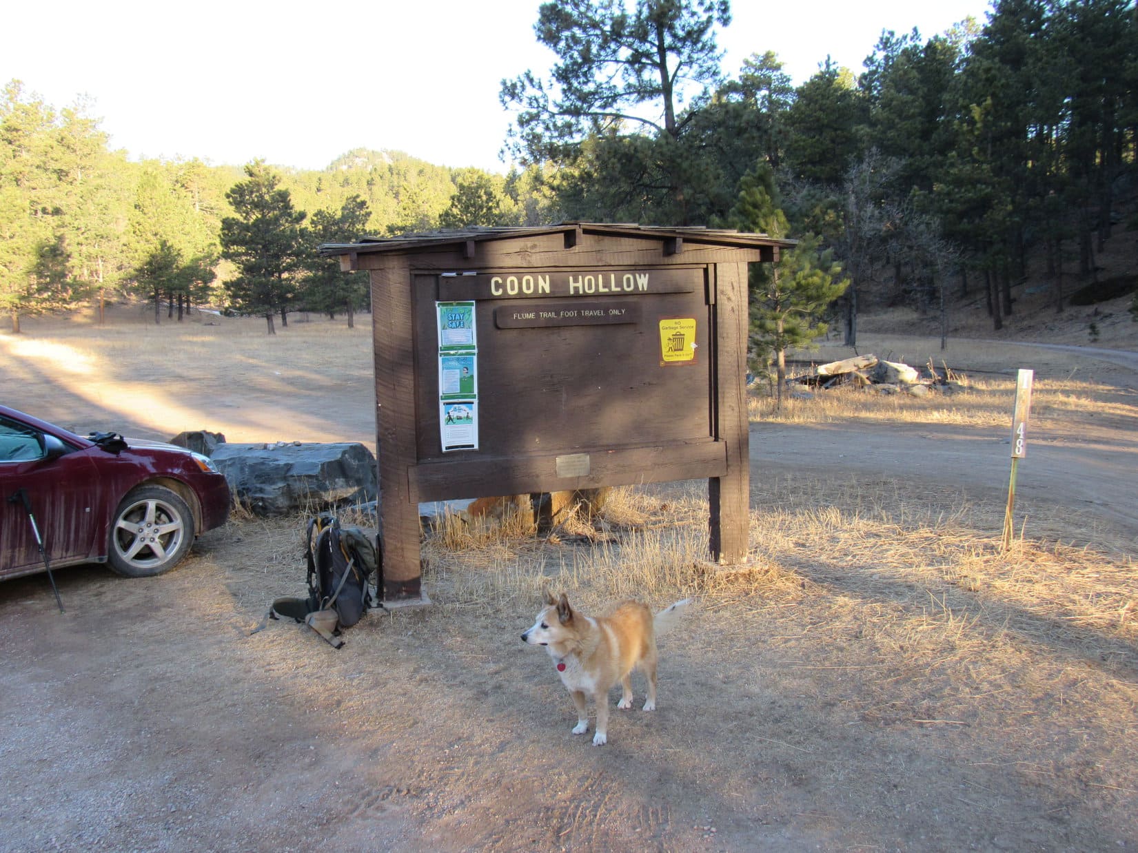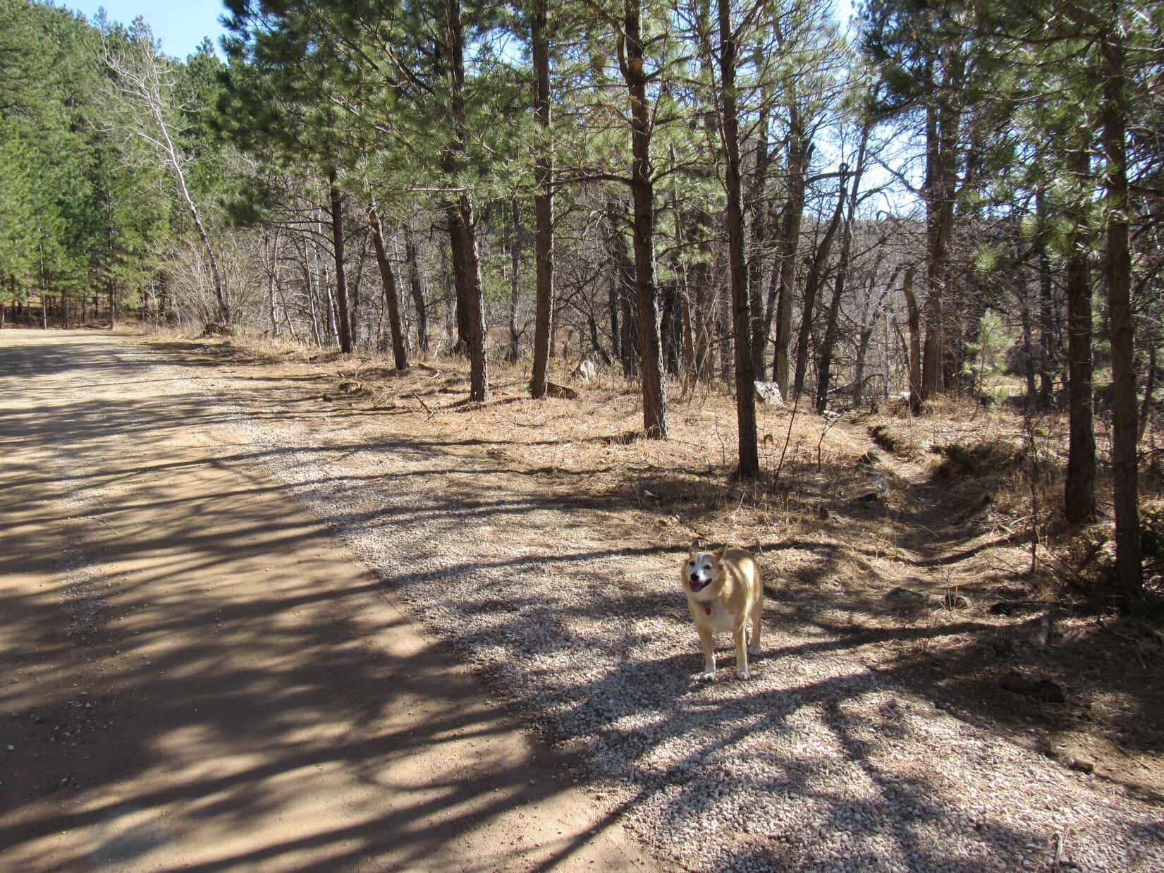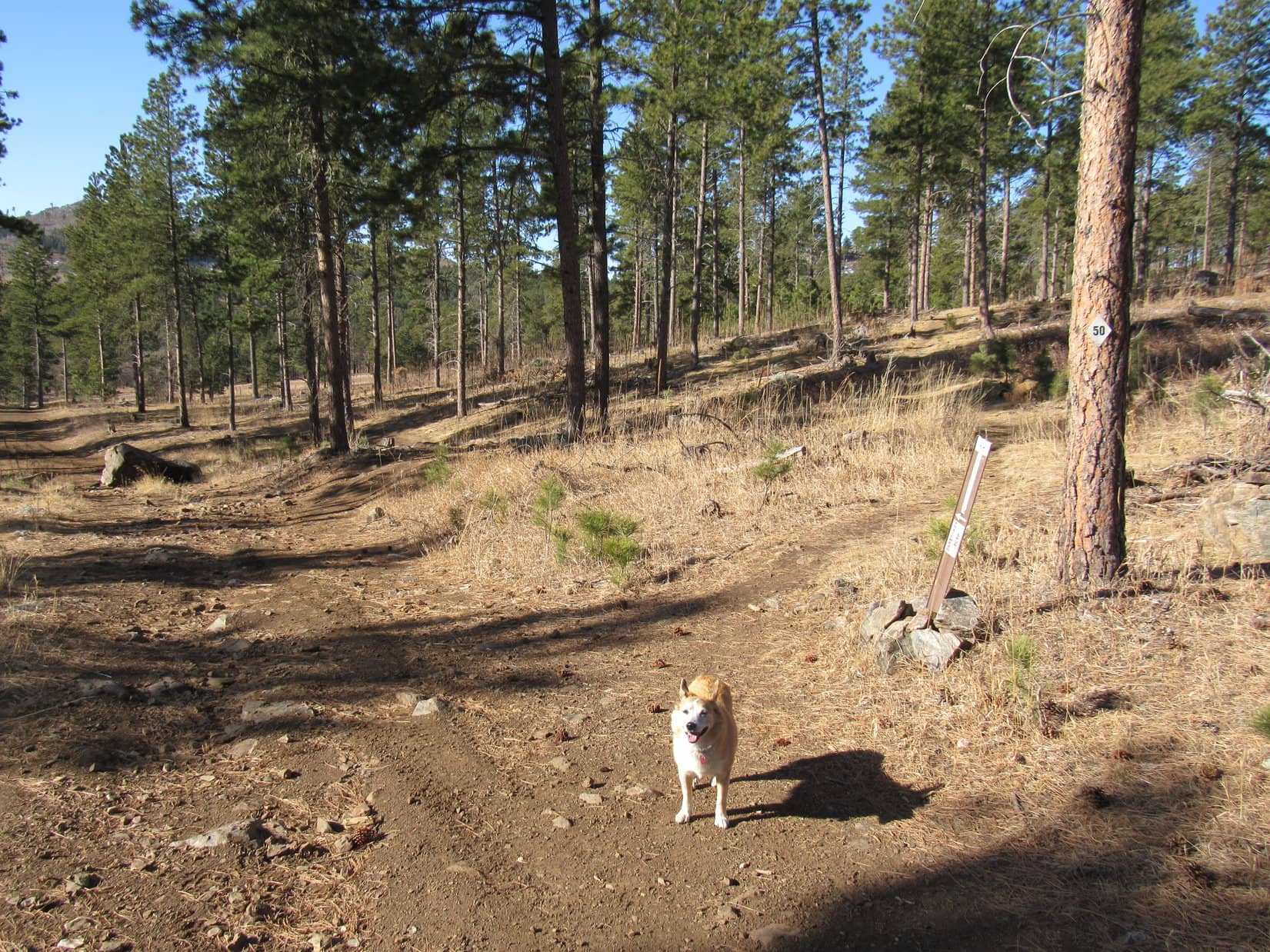 On a late September weekend, Iron Creek Trail No. 15 was surprisingly busy. Quite a few other canines were out exploring with their humans. Two in particular had some rather Old West names. Lupe and Laddie got to meet an Australian Shepherd named One-Eyed Jack, and a Husky named Outlaw. Jack actually had 2 eyes.