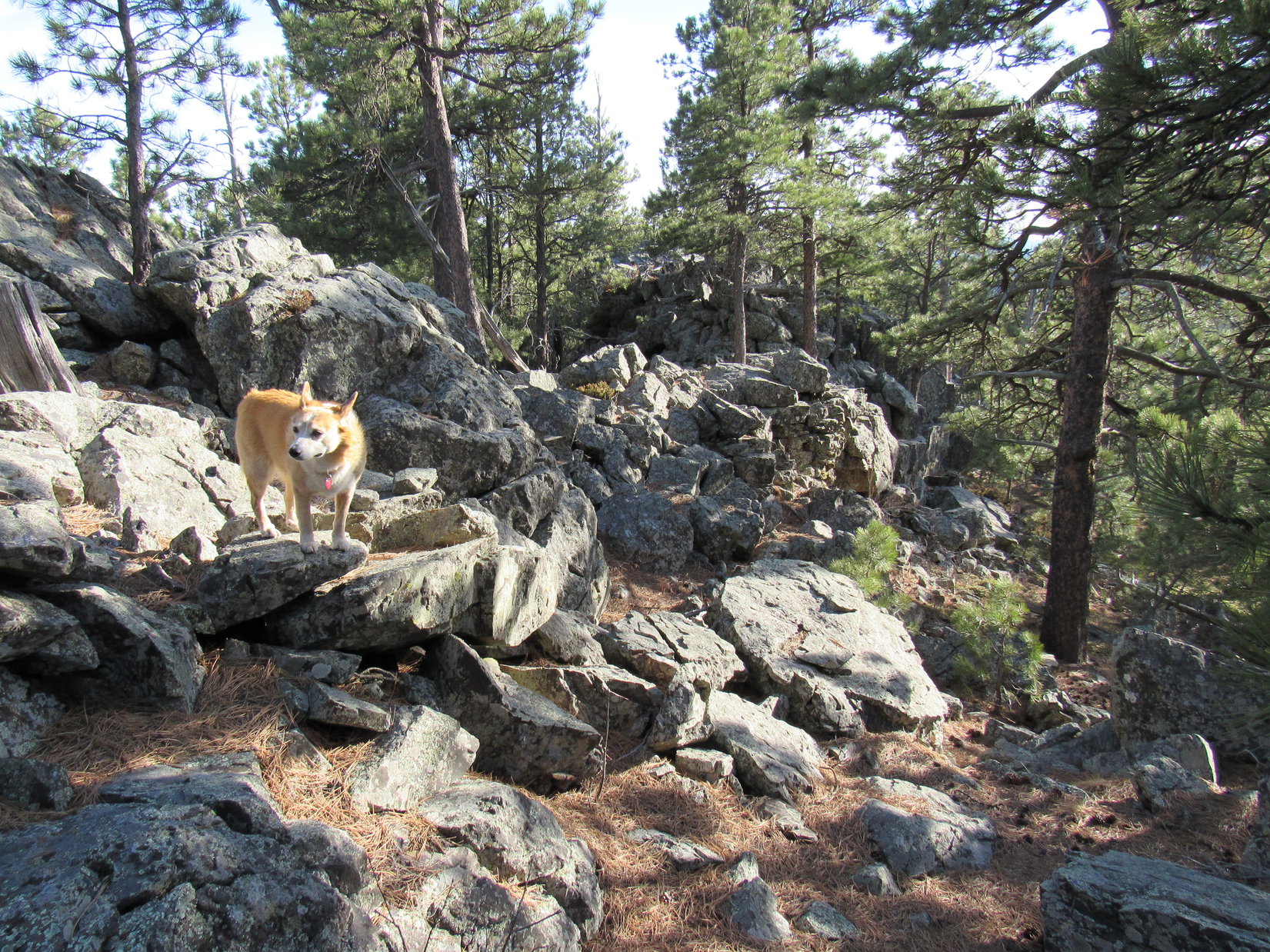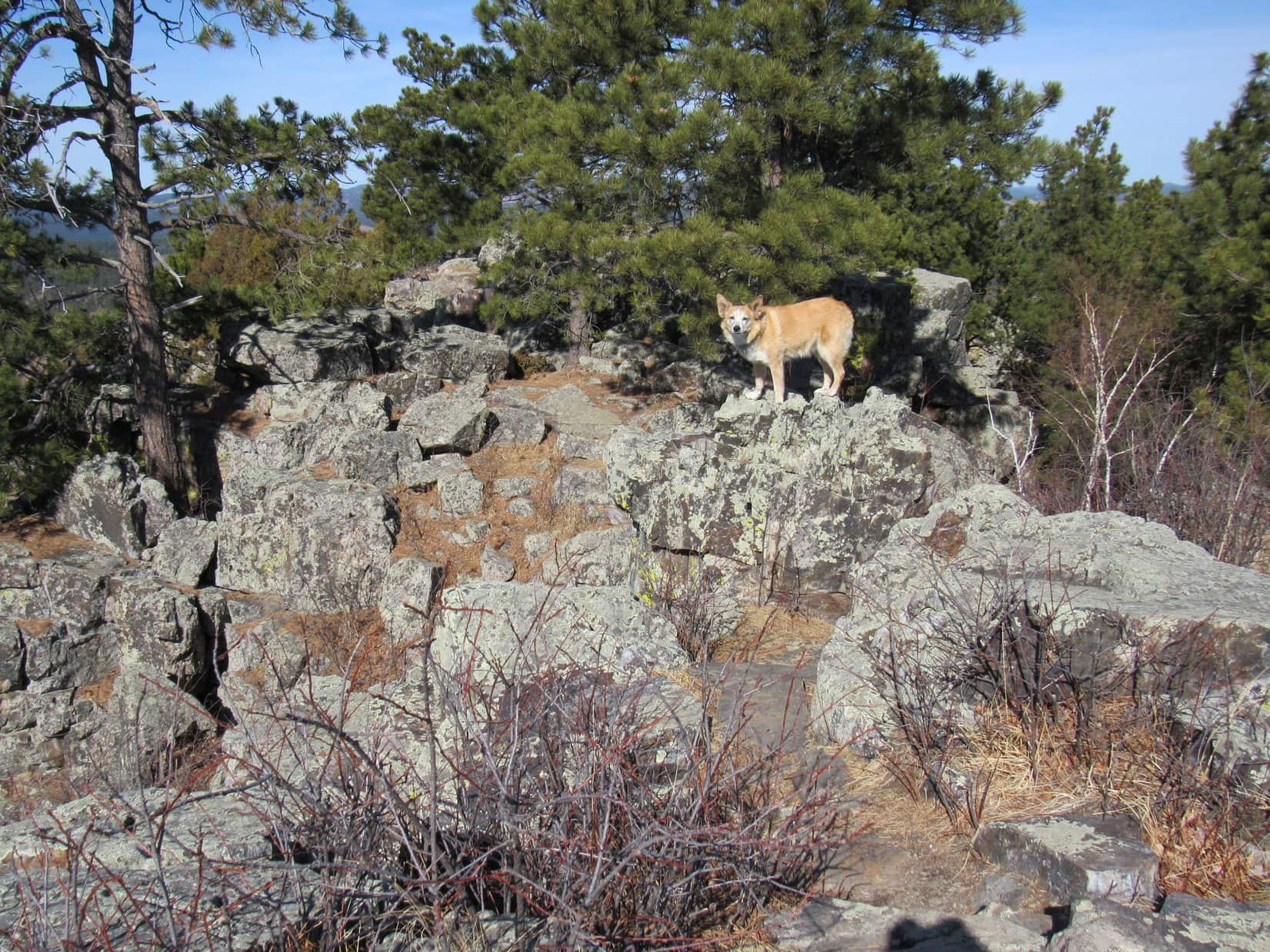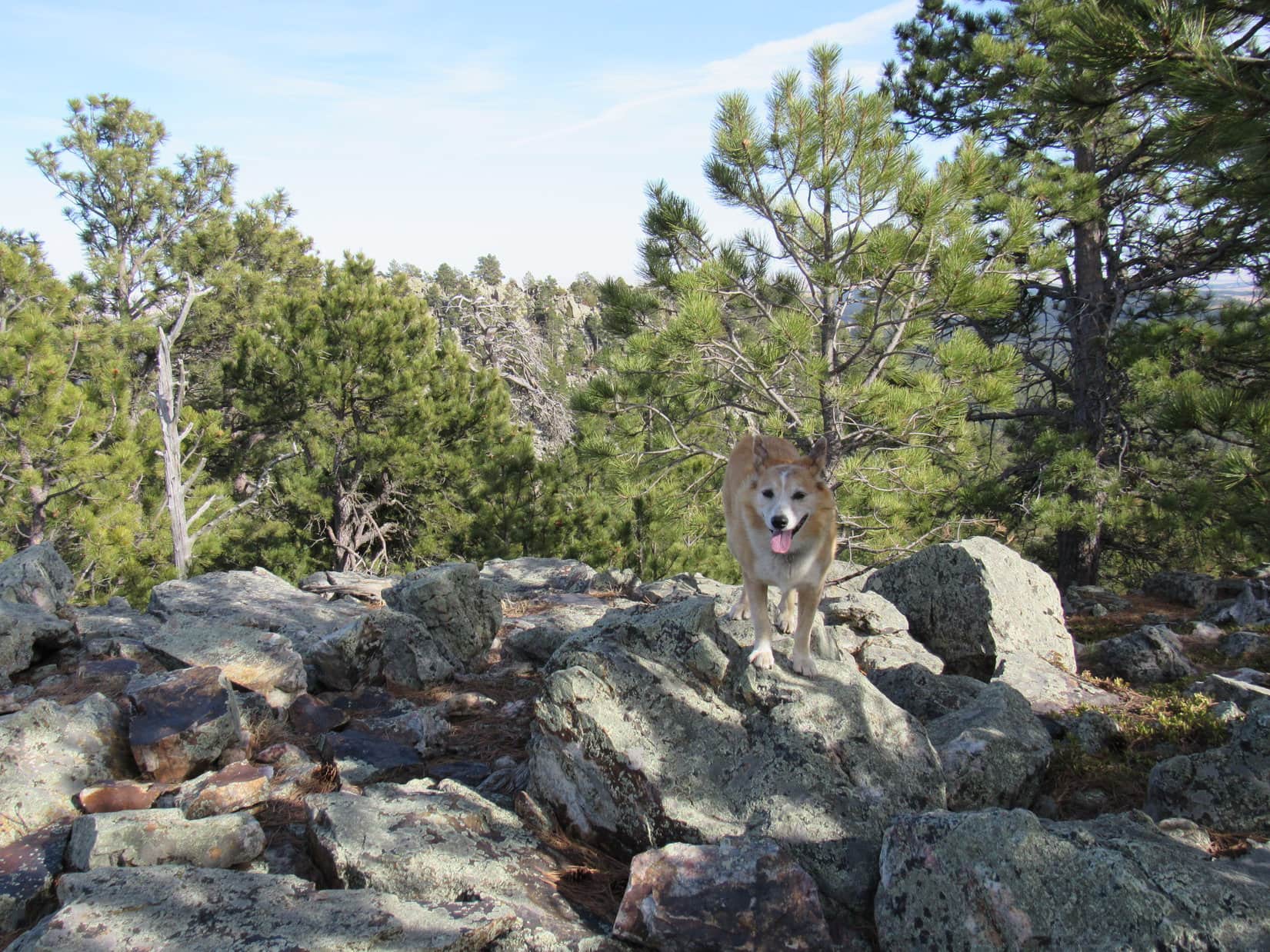 Well, this would never do! If Cousin Laddie hoped to be a peakbagging Sheltie in the Black Hills, he’d have to develop a little more spirit and gumption. Joe finally went down to Laddie, attached a leash, and with a gentle tug got him past the trouble spot. Only took a second or two. With Joe by his side, Laddie demonstrated more confidence.