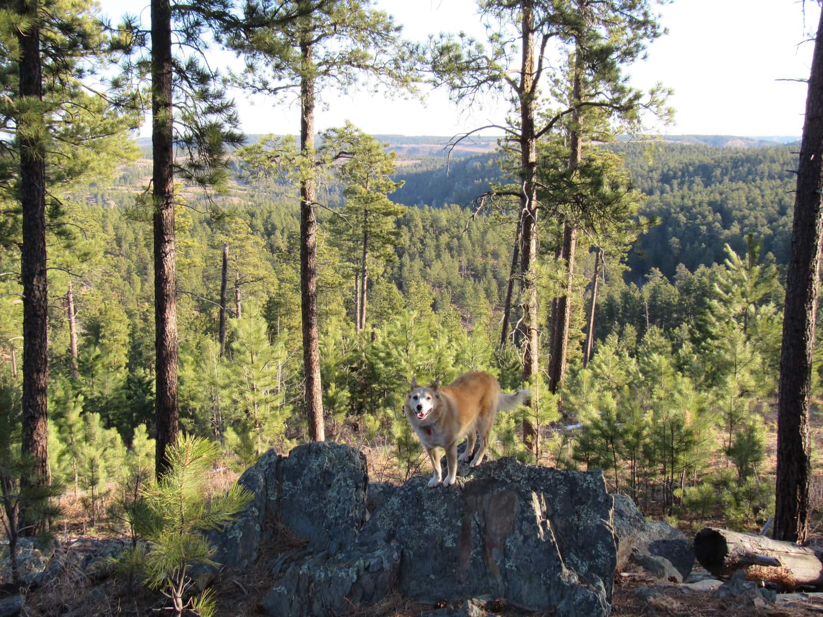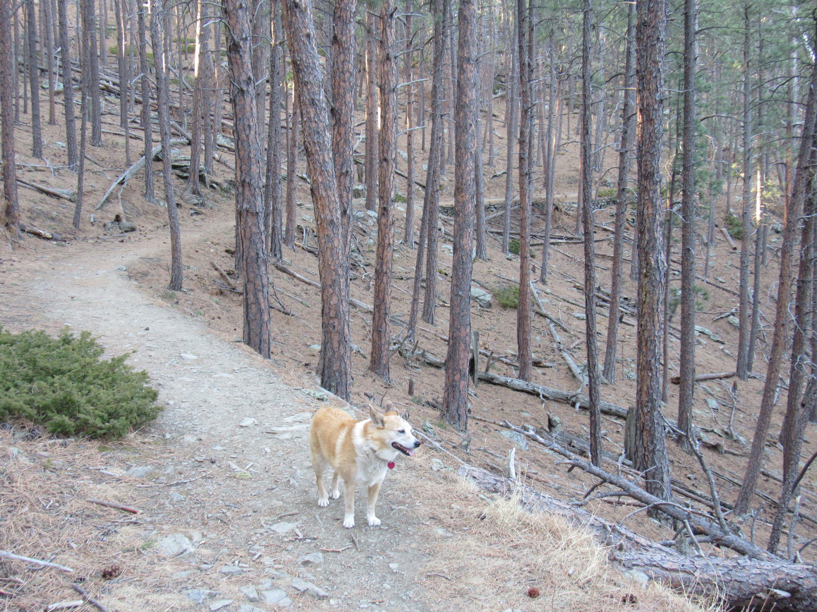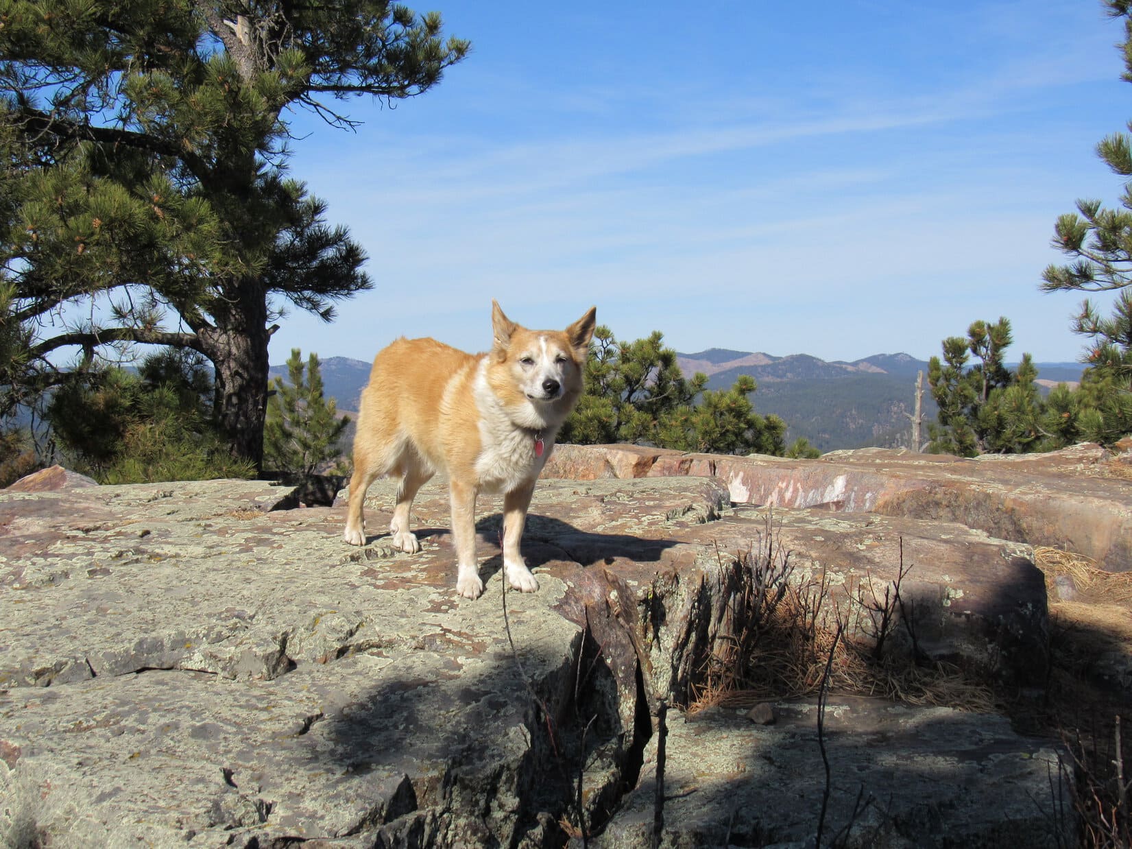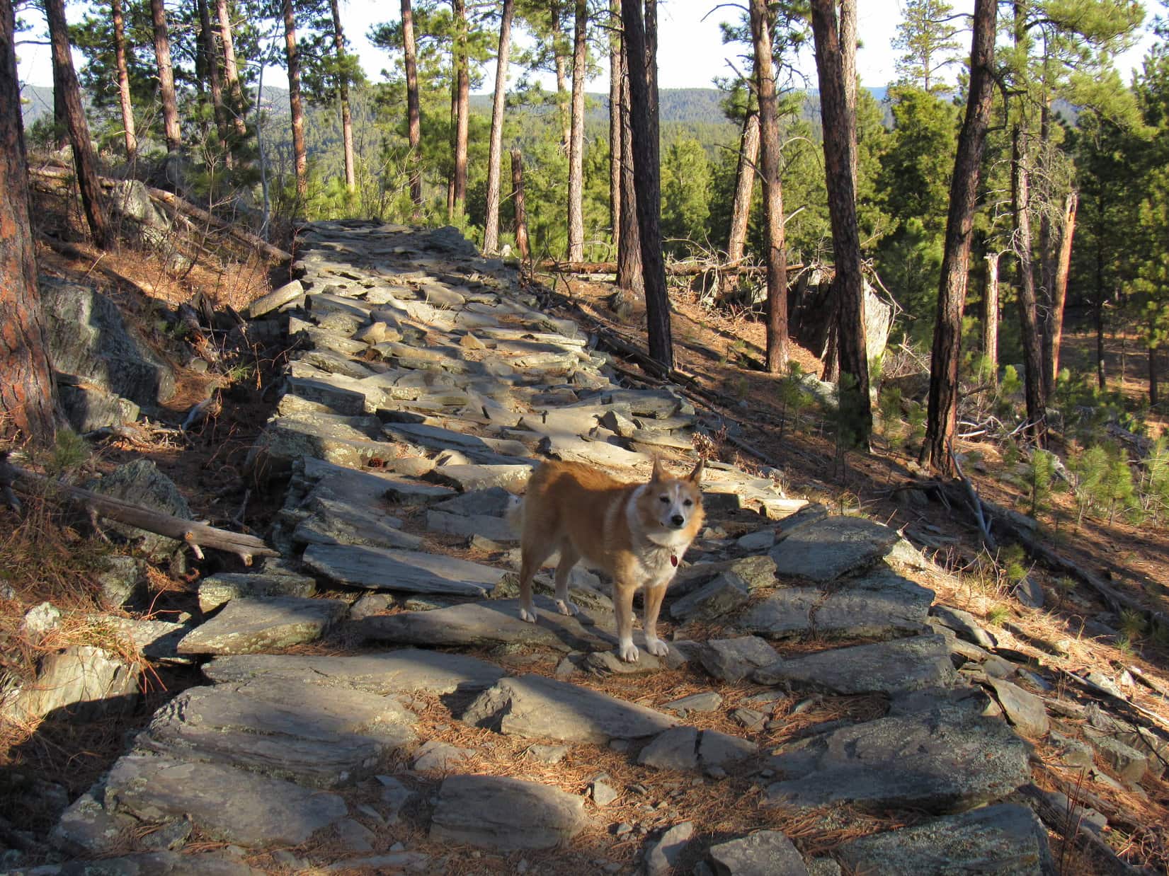 Well, this would never do! If Cousin Laddie hoped to be a peakbagging Sheltie in the Black Hills, he’d have to develop a little more spirit and gumption. Joe finally went down to Laddie, attached a leash, and with a gentle tug got him past the trouble spot. Only took a second or two. With Joe by his side, Laddie demonstrated more confidence.