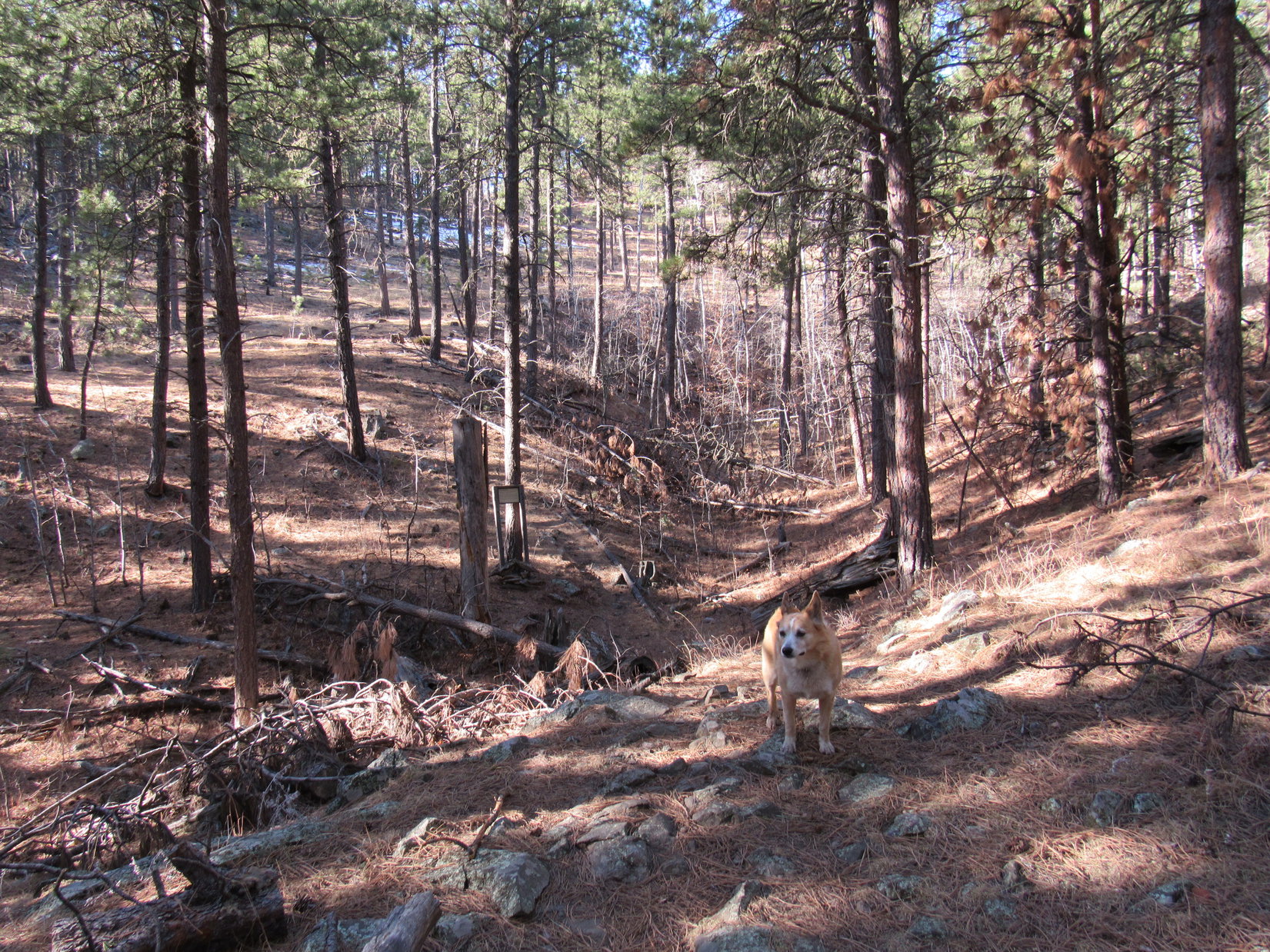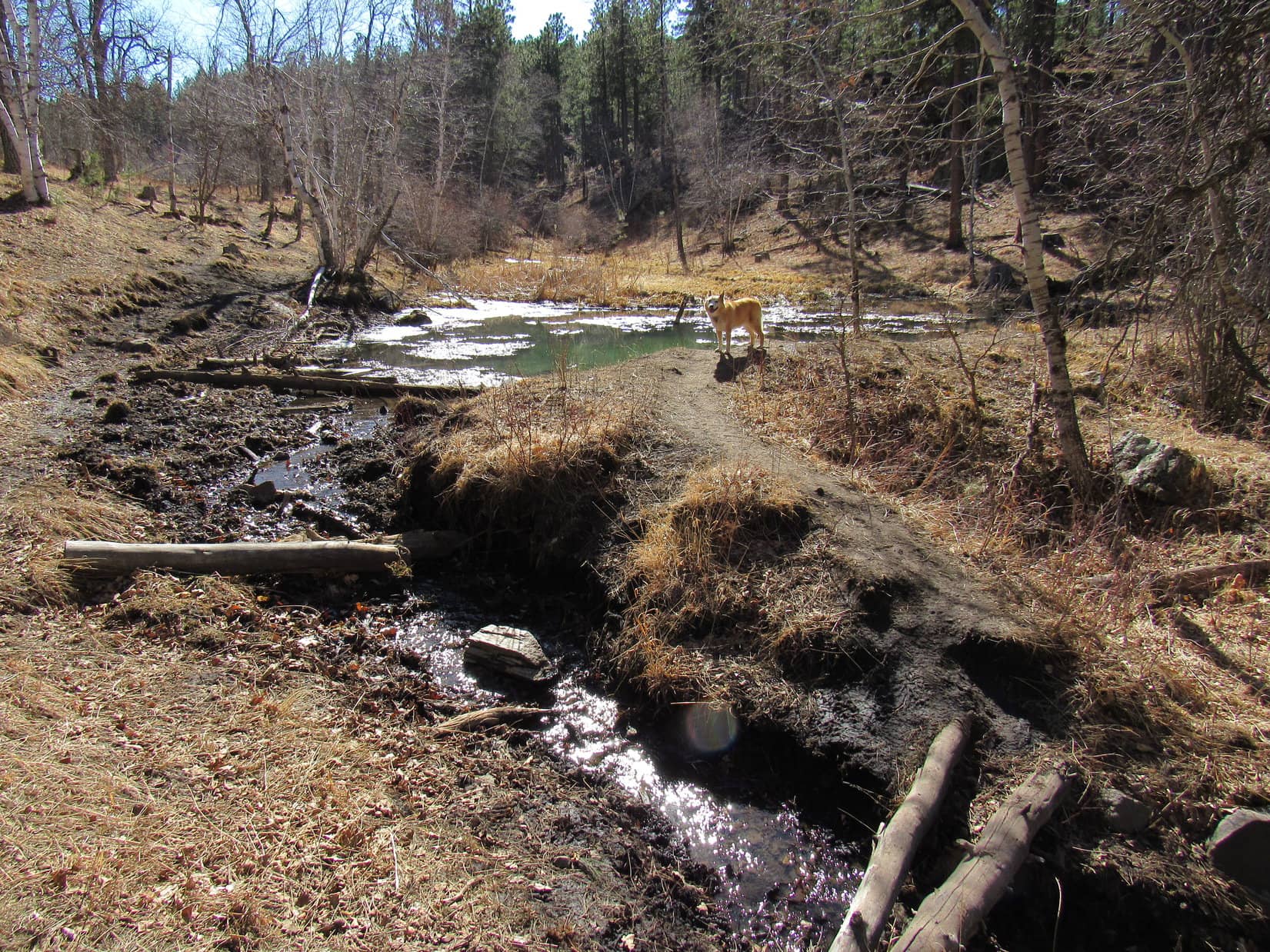Although Iron Creek Trail No. 15 was only going to wind gradually up the Iron Creek valley, a bit of Black Hills adventure dog training was in store for Cousin Laddie. The trail would cross Iron Creek 11 times over just a couple of miles.