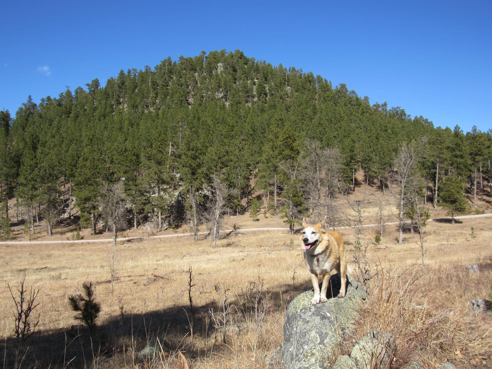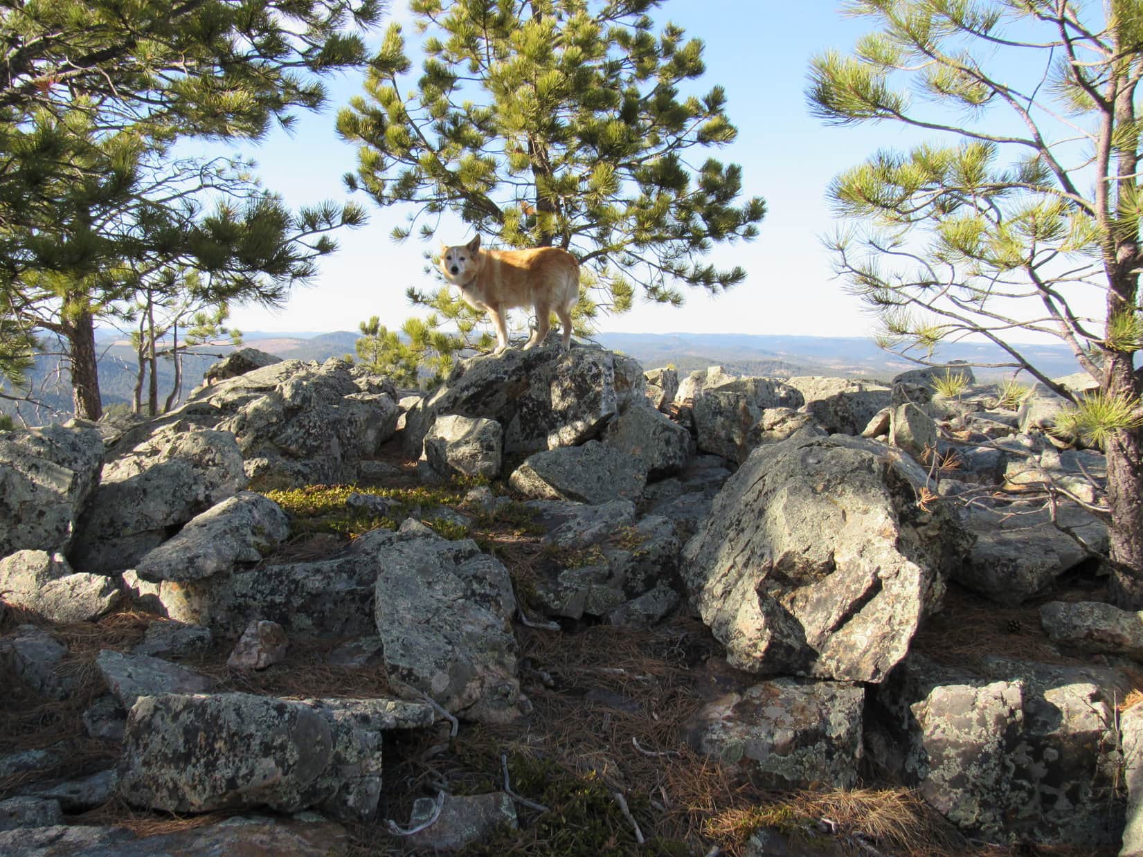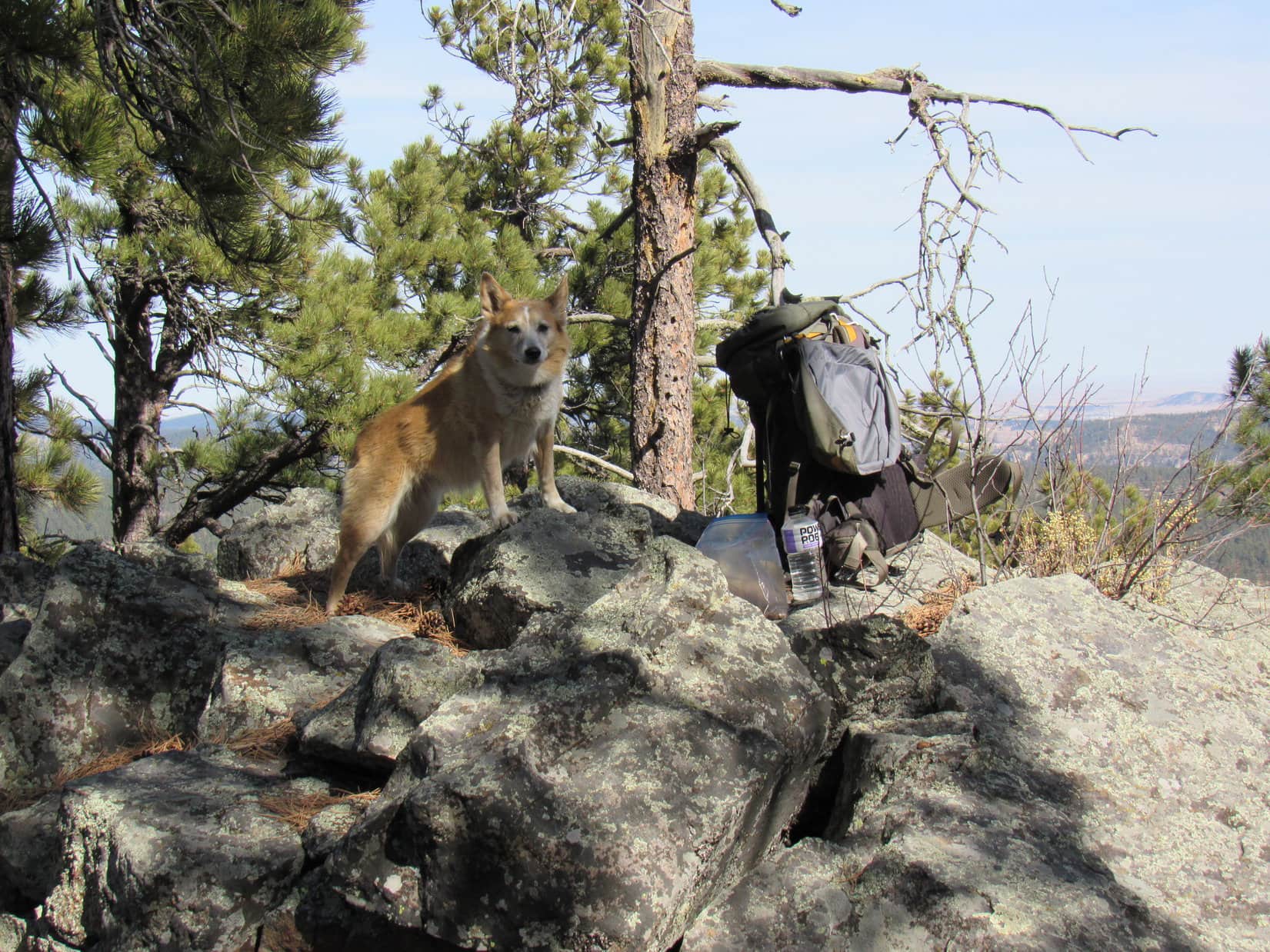 Boulder Hill (5,331 ft.) was a short, easy trek, offering plenty of scenic bang for relatively little effort. At least, that was the general consensus among Lupe, Joe and SPHP. Laddie had no expectations, having never been to Boulder Hill before. All went well until the access road ended at the base of the rocky ridge atop the mountain. Partway up the single track trail that wound up to the summit, there was a spot requiring a pretty good jump for Laddie’s short legs.