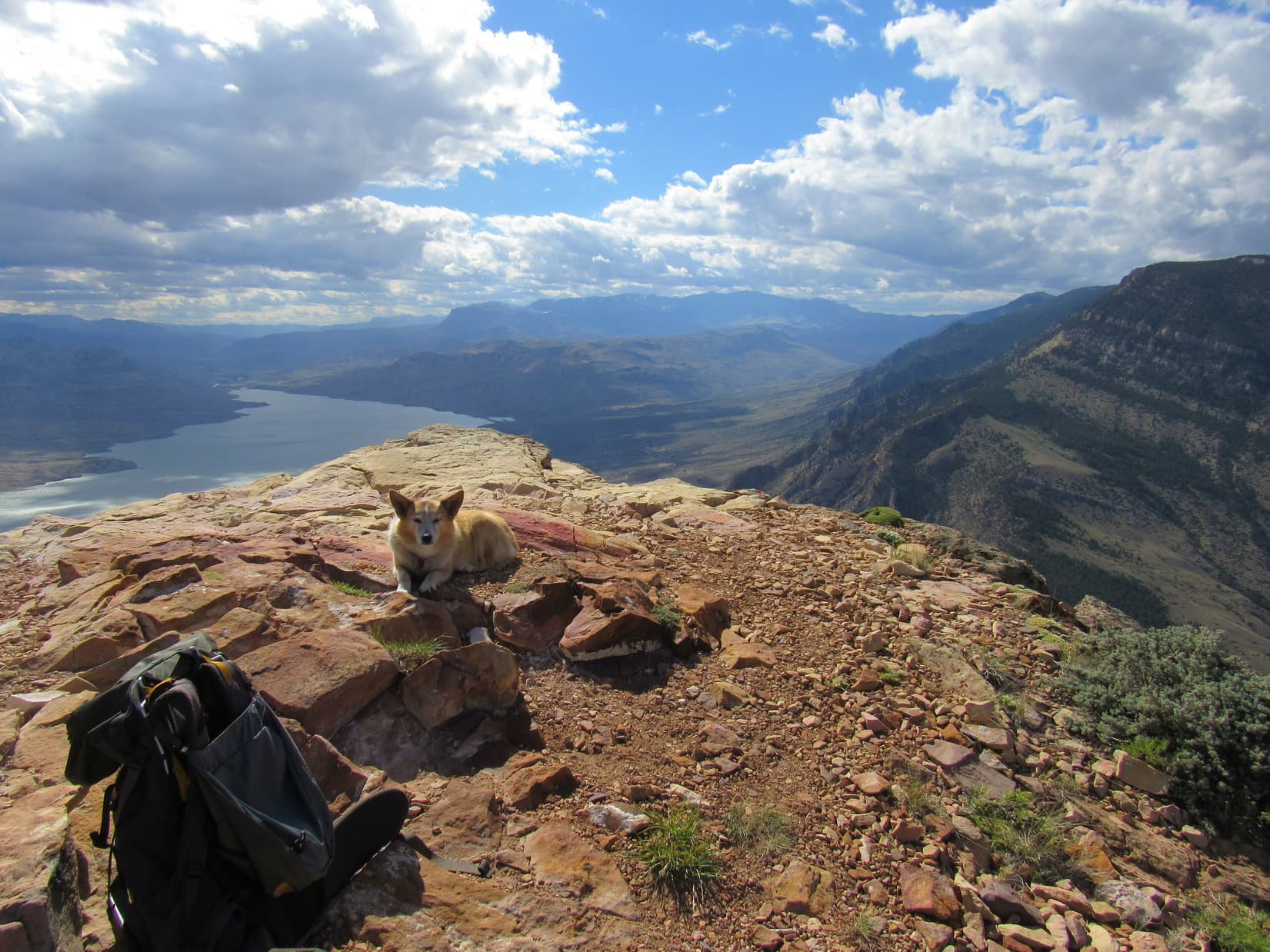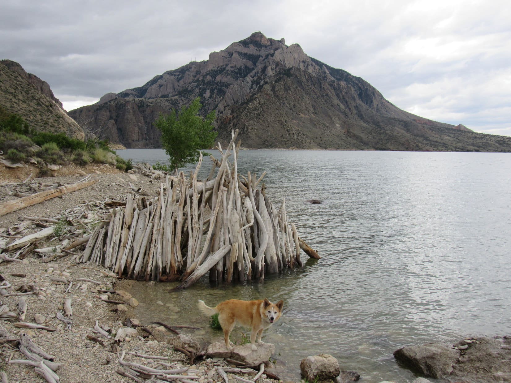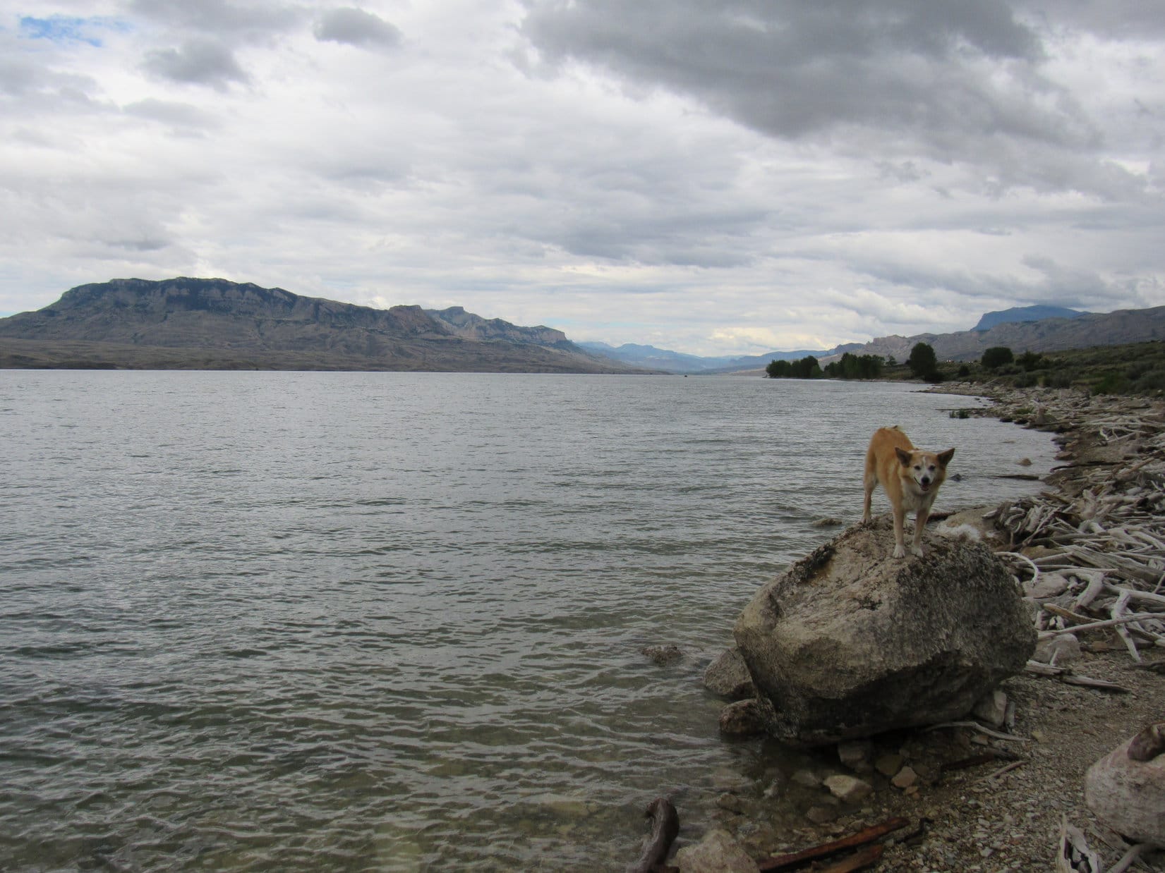 Happy to escape the RAV4 for a while, Lupe accompanied SPHP down to Buffalo Bill Reservoir’s shoreline, a rocky beach littered with driftwood bleached white by the sun. The beautiful lake consisted of two big arms, one extending miles W near the highway and another off to the S.