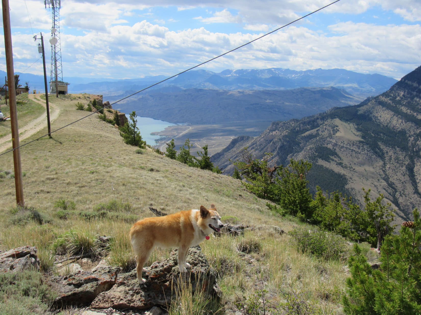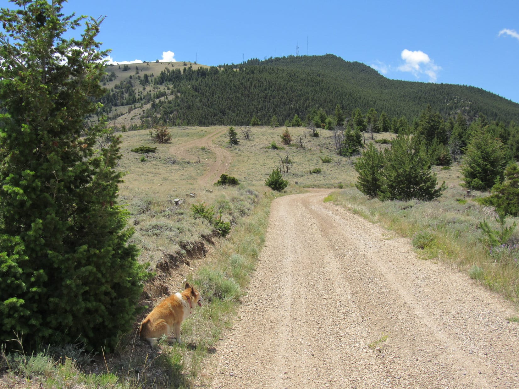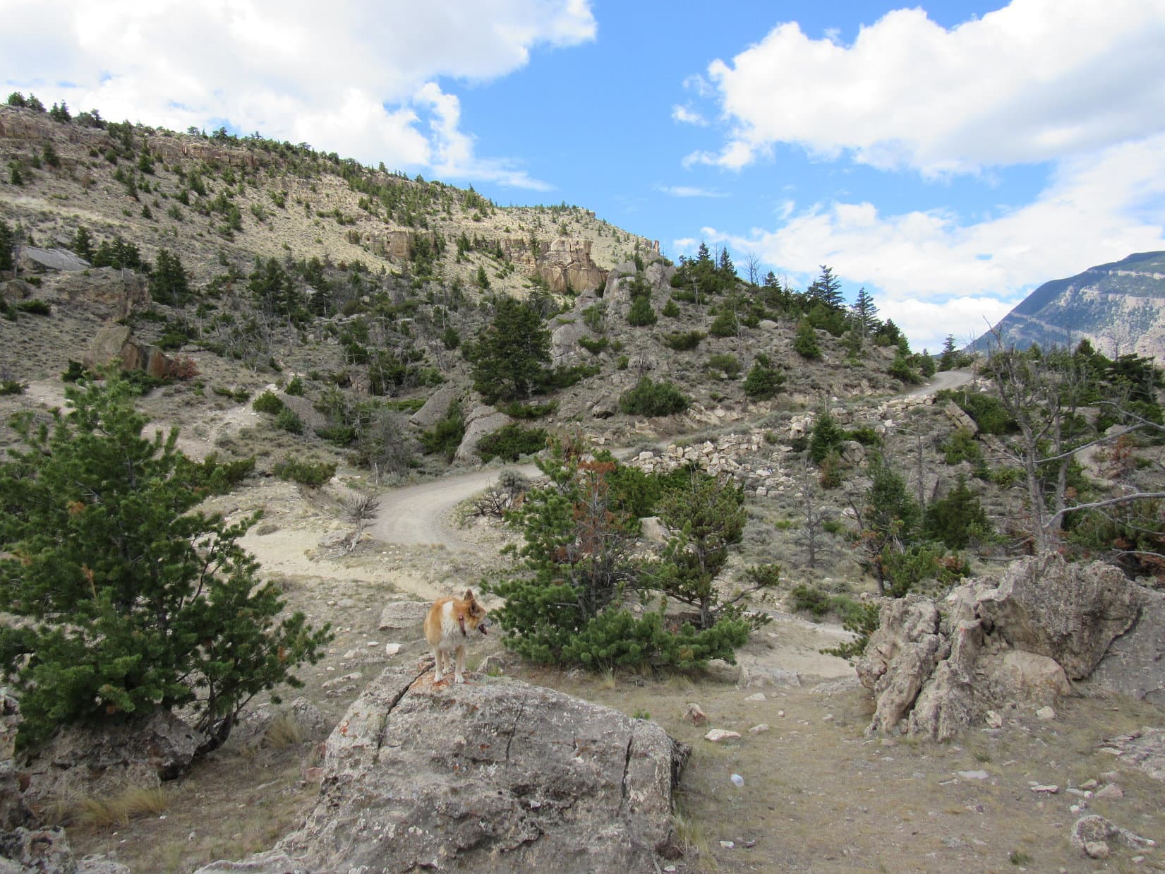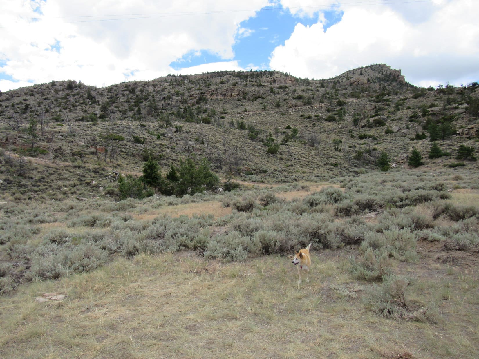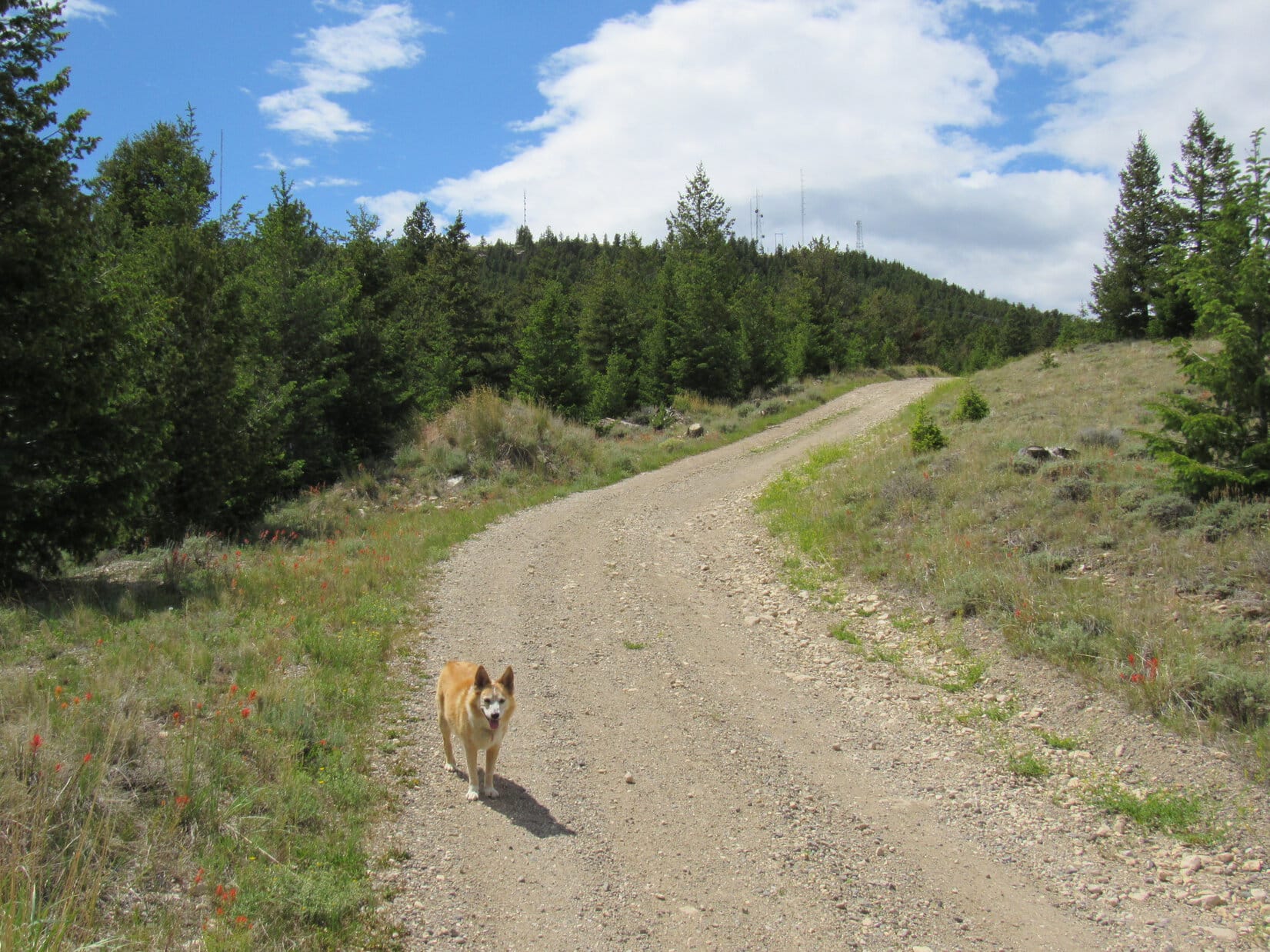 The road hike wasn’t very exciting, but at least it was easy, just a steady climb winding up the mountain. The predominate sagebrush didn’t block the views, which inevitably improved as Lupe trudged higher. Cumulus clouds sailed overhead providing shade, but whenever the sun came out, so did the Carolina Dog’s tongue. Starting to get hot!