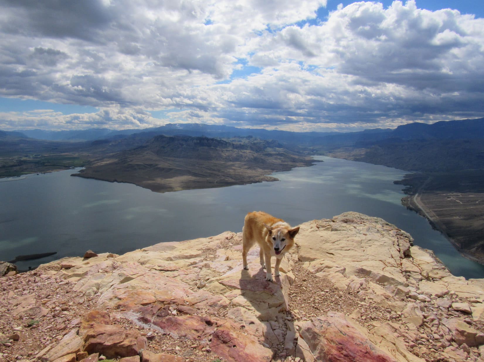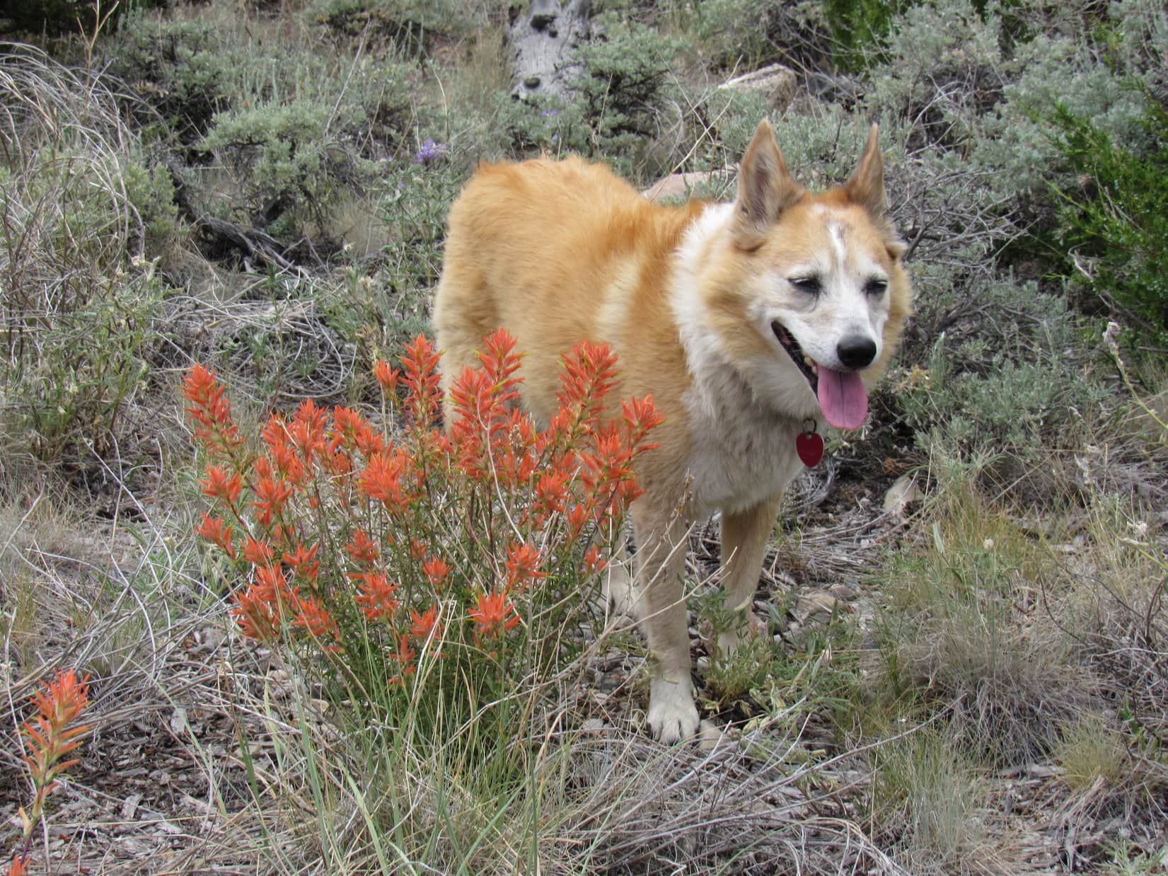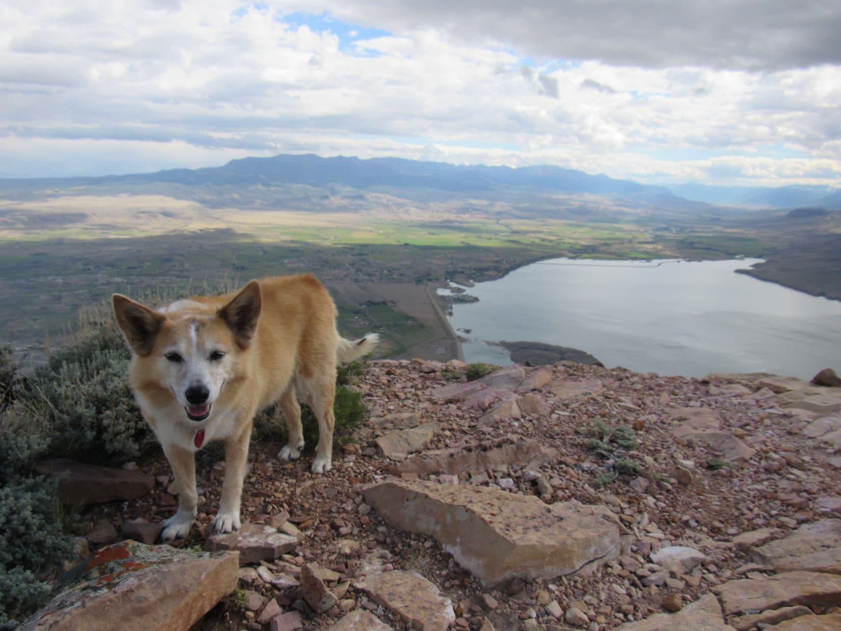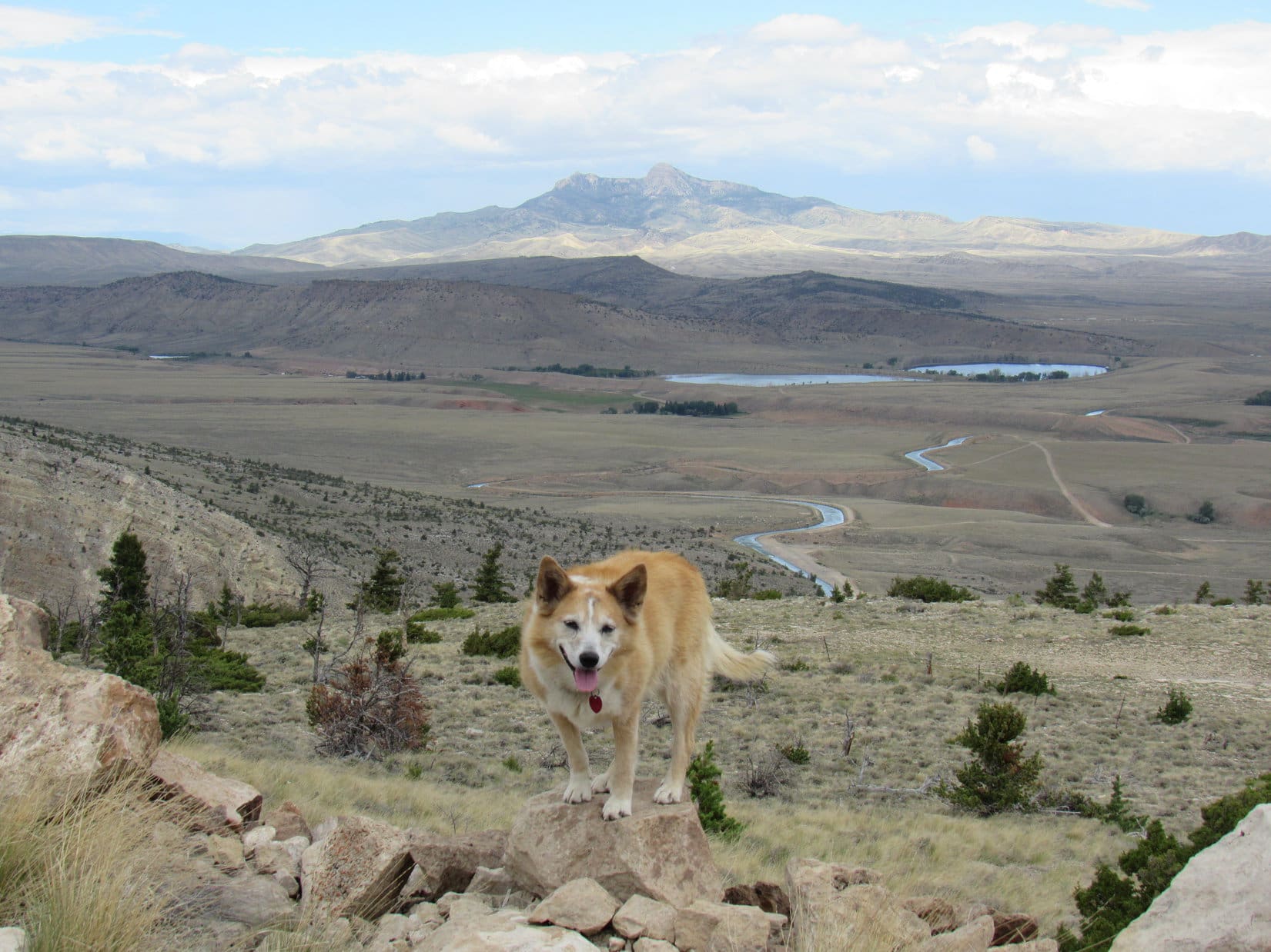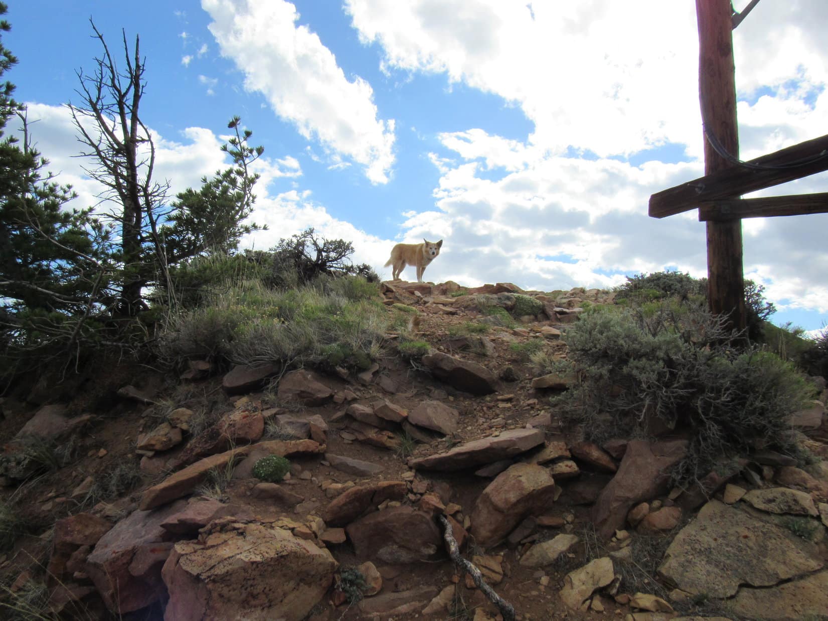 The road hike wasn’t very exciting, but at least it was easy, just a steady climb winding up the mountain. The predominate sagebrush didn’t block the views, which inevitably improved as Lupe trudged higher. Cumulus clouds sailed overhead providing shade, but whenever the sun came out, so did the Carolina Dog’s tongue. Starting to get hot!