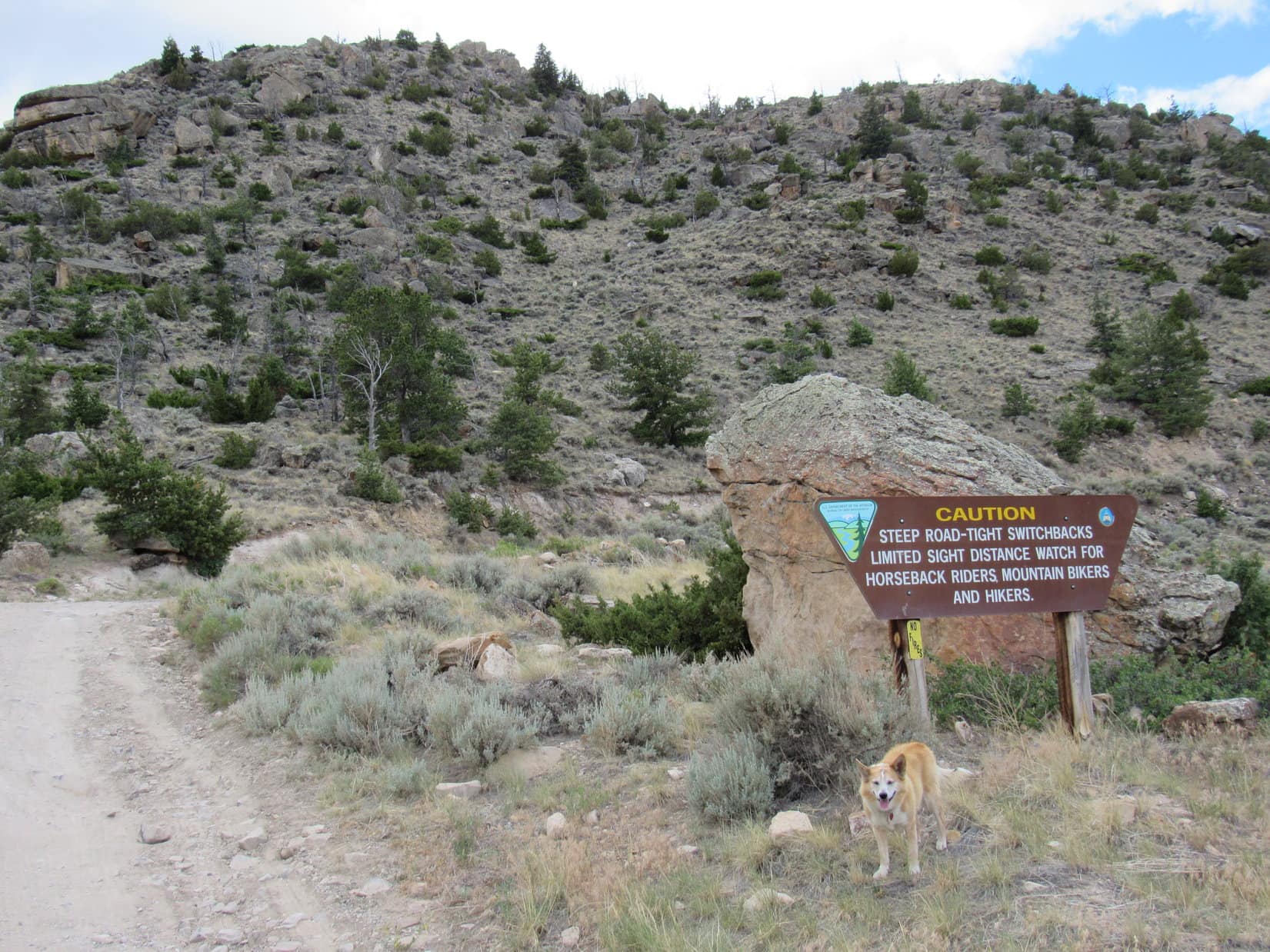 11:59 AM, 67ºF – Ready to go! The American Dingo left the trailhead on a dusty path which soon joined an even dustier trail used by the trail ride horses. Cedar Mountain’s lower slopes were sparsely dotted with cedars, alright, but Sagebrush Mountain might have been a better name. The horse trail quickly led to Spirit Mountain Road, which could be seen switchbacking ever higher up the NE slope.