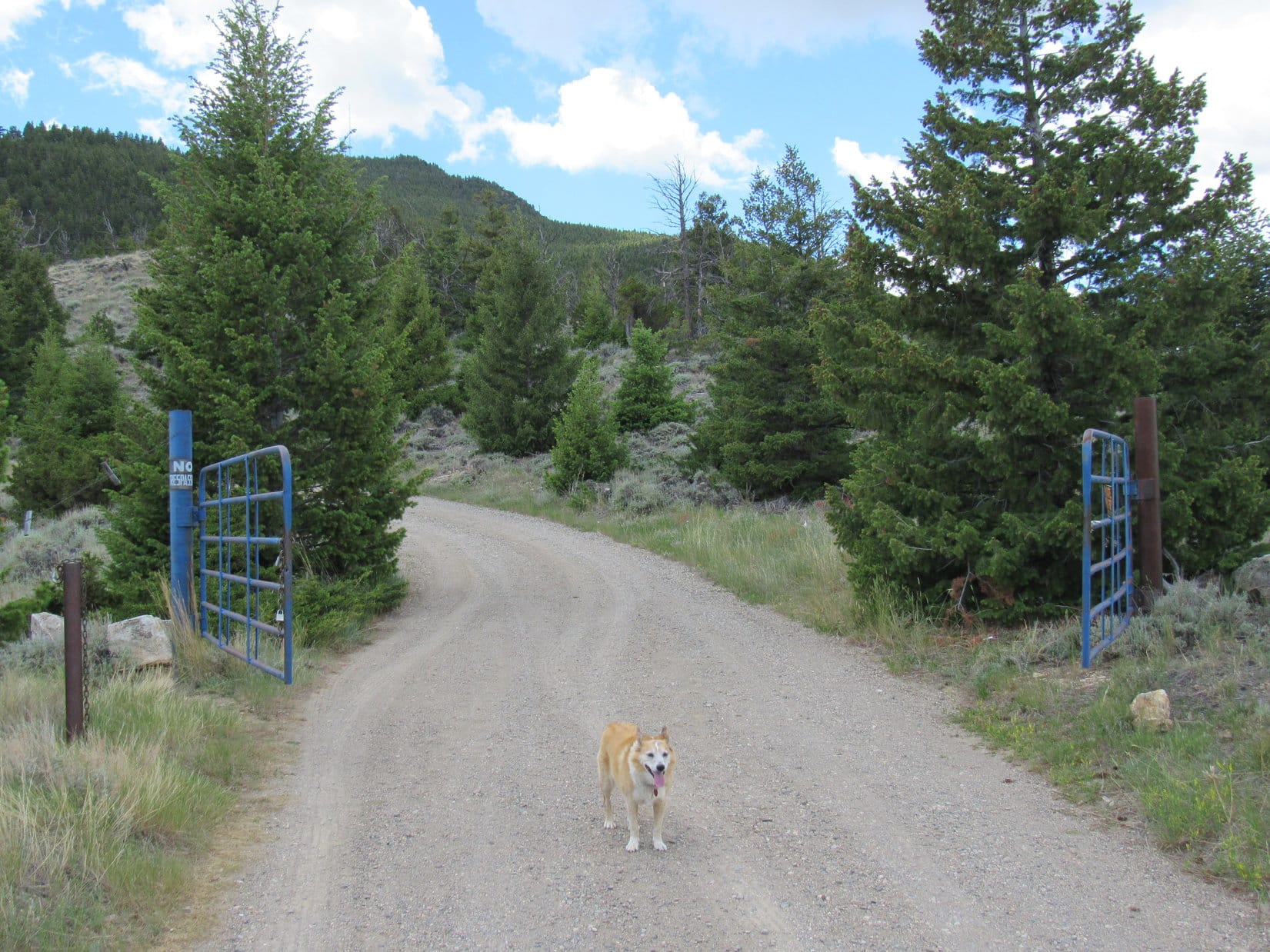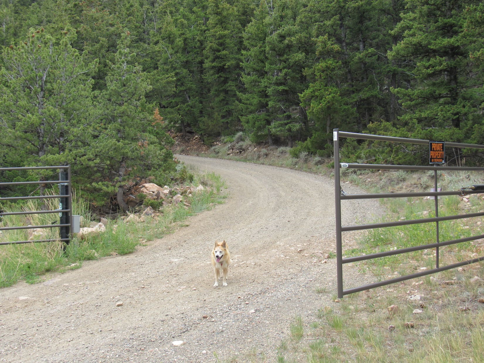 The American Dingo pressed on, coming to a brown gate, also open, 15 minutes later. Beyond the brown gate the road resumed its climb. Lupe passed through a short stretch of much thicker cedar forest. Beyond the forest, she entered more open territory again. This region was grassier with far less sagebrush.