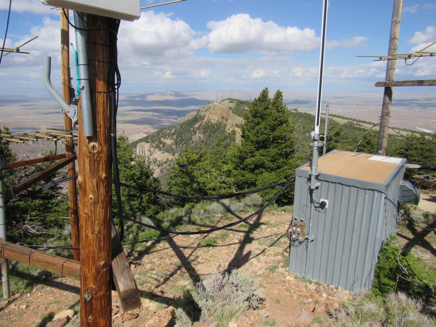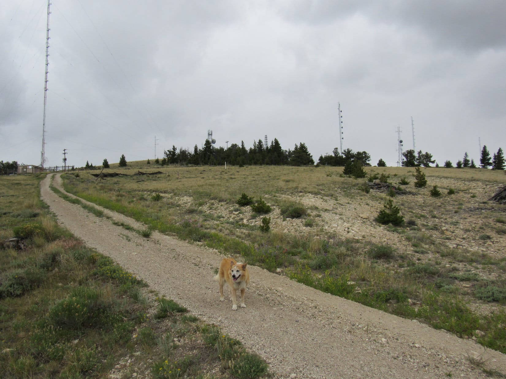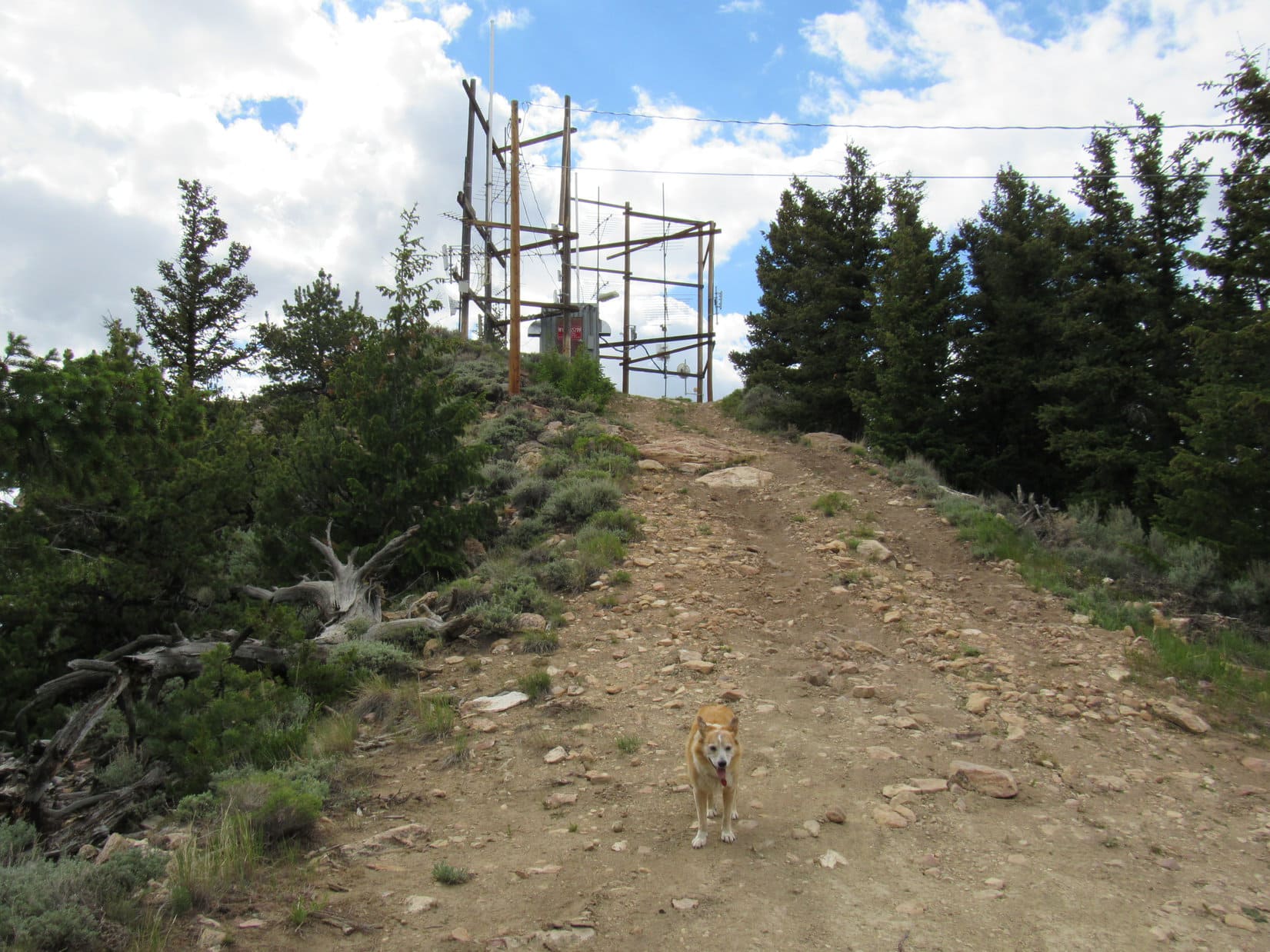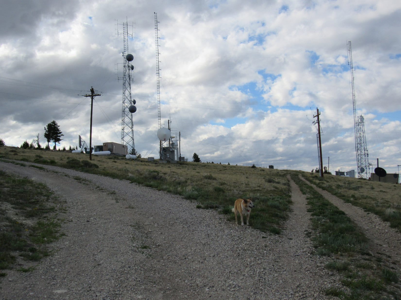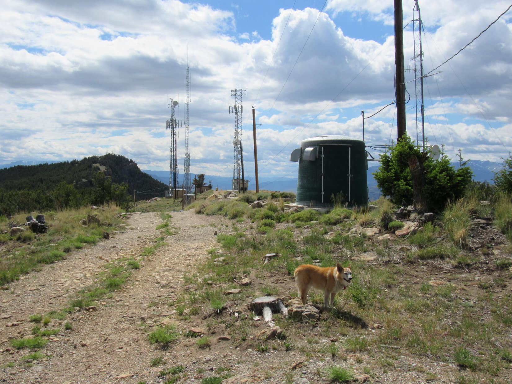 Although Cedar Mountain’s E summit region incorporated quite a large area, Lupe didn’t have much farther to go to get to the top. After passing W through another stretch of forest, the road climbed a small rise. Here, several more towers and sheds were scattered along a narrow ridge.