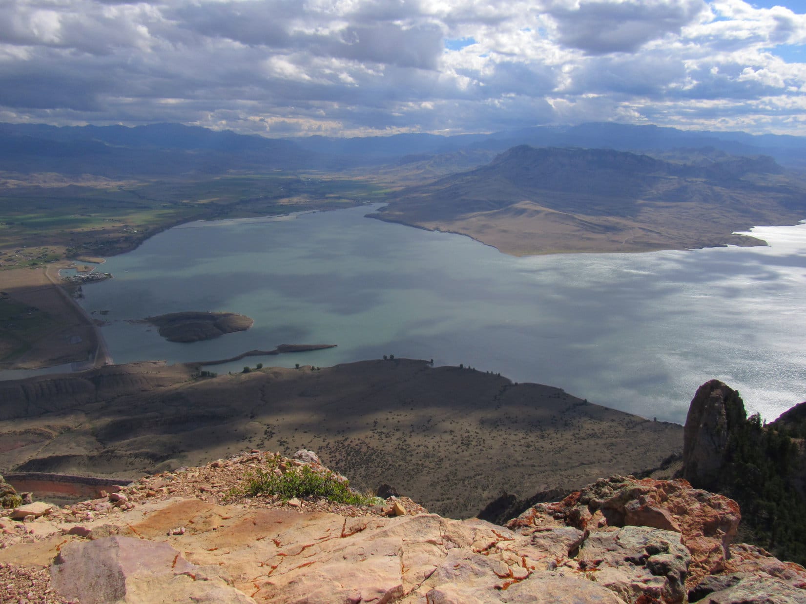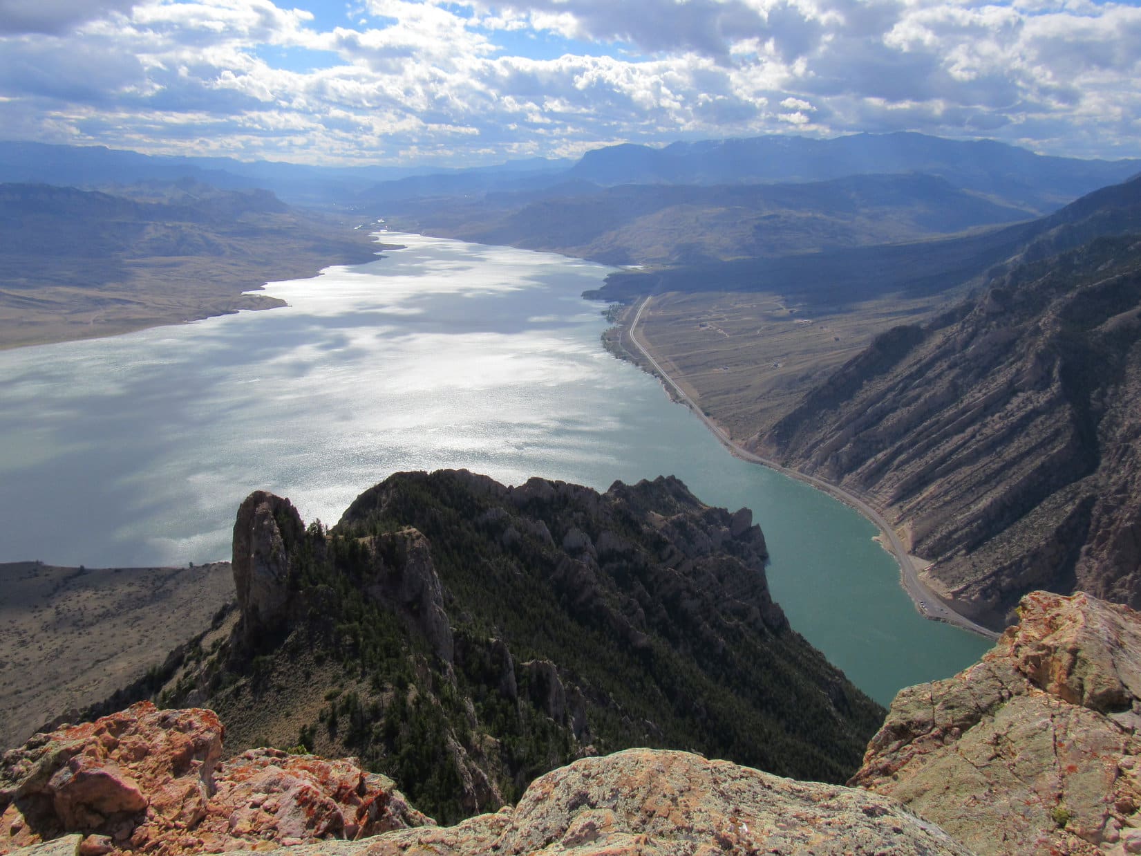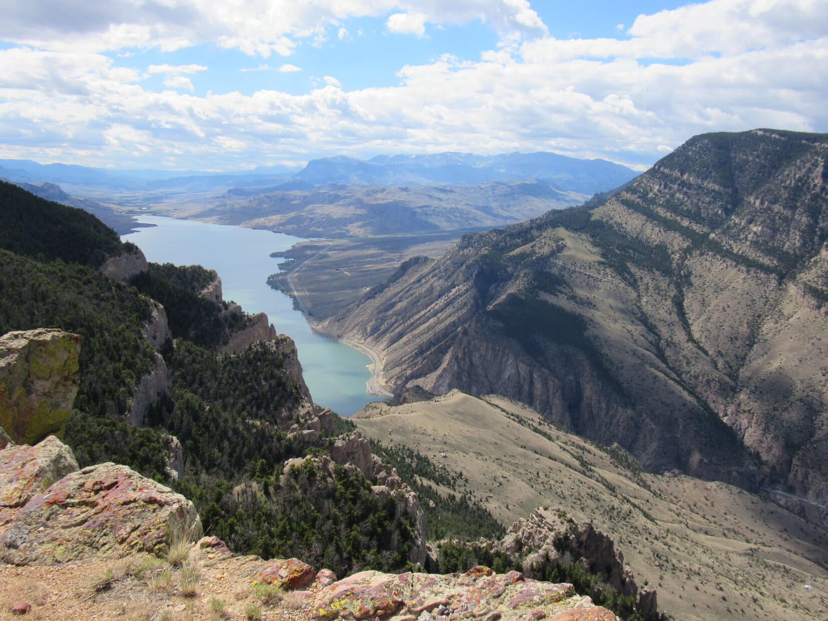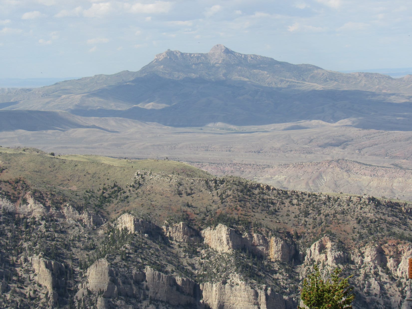 A small rock outcropping proved to be the high point. For the first time during her ascent, Lupe had a view to the W, quite a spectacular one overlooking the Shoshone River canyon and the N shore of Buffalo Bill Reservoir. Rattlesnake Mountain (9,116 ft.) was just across the canyon, and Trout Peak (12,244 ft.) was visible among others on the horizon.
