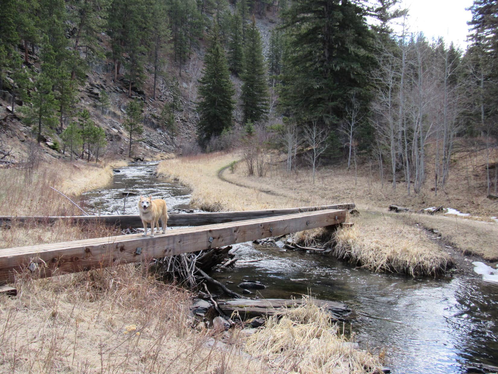 Nearly 0.4 mile W of Spurgeon Gulch and Canyon City, Lupe came to a 6th and final pawbridge over Rapid Creek. Crossing it, she followed a long straight stretch of Deerfield Tail No. 40 going WSW on the S side of the creek. In the shade of a mountain, much of this part of the trail was still icy. After 0.33 mile, Lupe came to a big bank of ice at the confluence of Slate Creek and Rapid Creek.