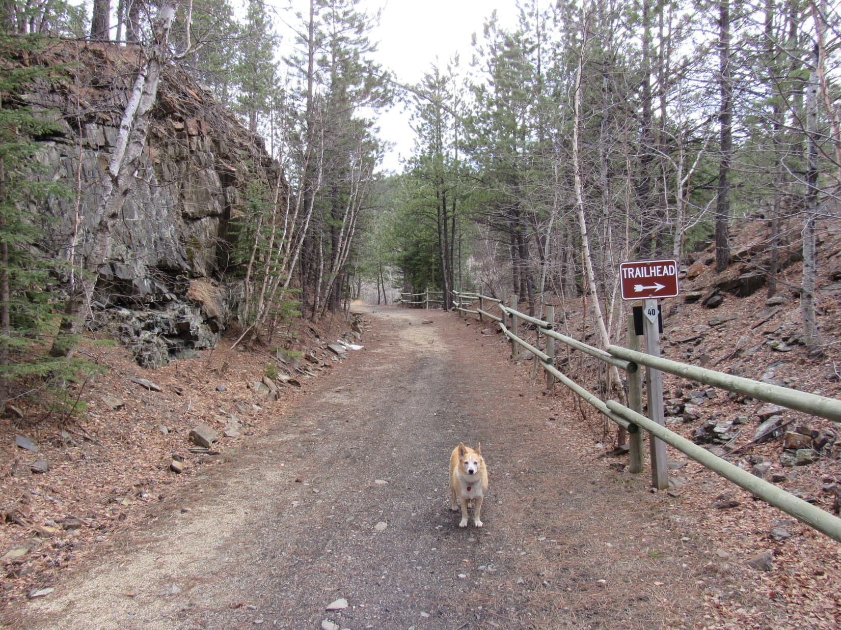 From the pass, No. 245 went NW down Lind Gulch for more than a mile. A bit muddy at first, the road hike was super easy, although not terribly interesting. After losing 400 feet of elevation, Lupe finally reached a gate where the Mickelson Trail crossed the road.