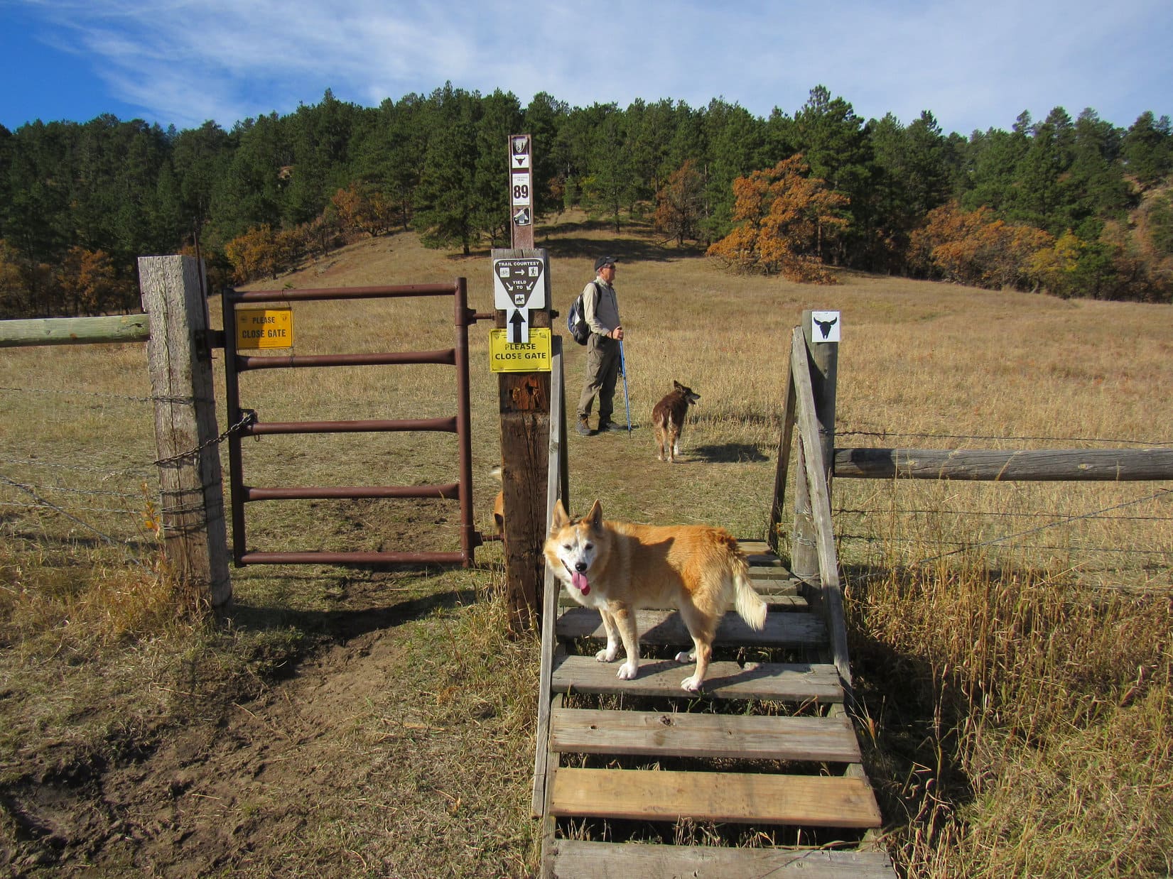 The first part of the trail was an easy stroll through the grasslands. Soon Bear Butte(4,422 ft.) was coming into view. At the top of a rise, the trail diverged by a gate in a barbed wire fence. Centennial Trail No. 89 went L here, heading W for a forested ridge.
