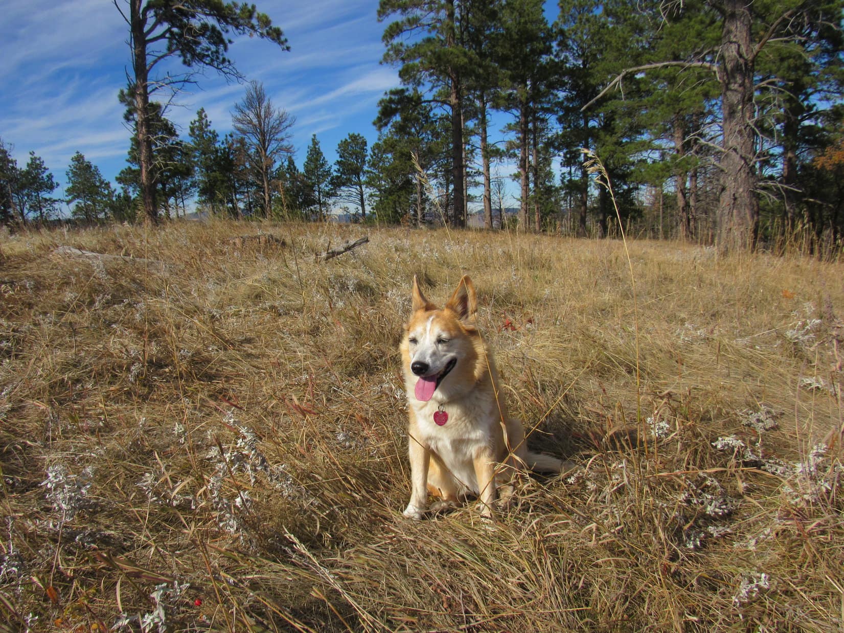 Relaxing in the shade at the end of the Ponderosa hike. Photo looks SW.New cousin Laddie taking it easy on his first ever Black Hills expedition.