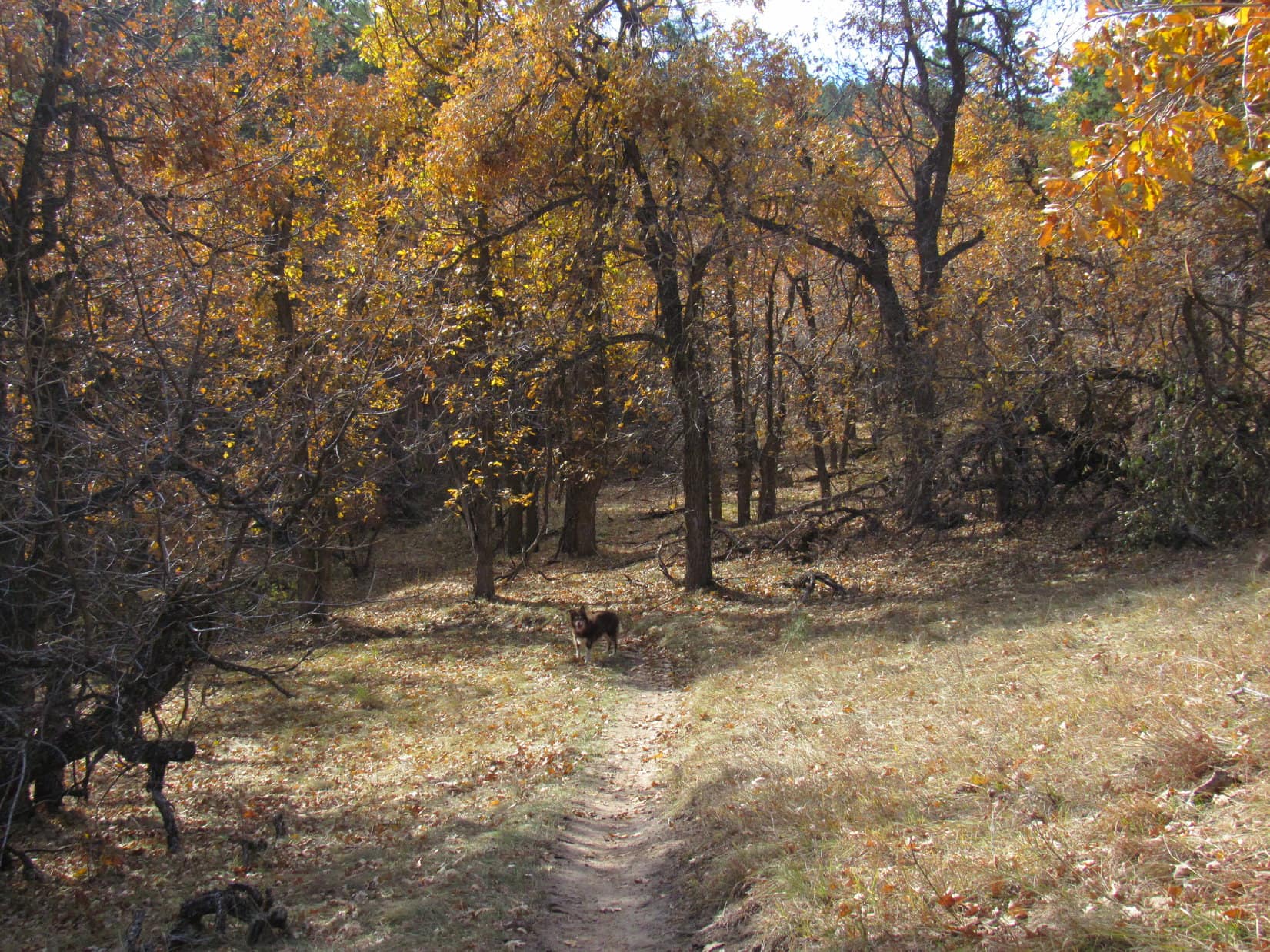 Upon entering the forest at the base of the ridge, Centennial Trail No. 89 continued W, working steadily higher on a winding course. At nearly the end of October, autumn leaves still clinging to the scrub oaks were well past their scenic best, but did add splashes of color. Cousin Dusty, a veteran of many prior adventures in the Black Hills, was doing great! She often took turns leading the way with Lupe.