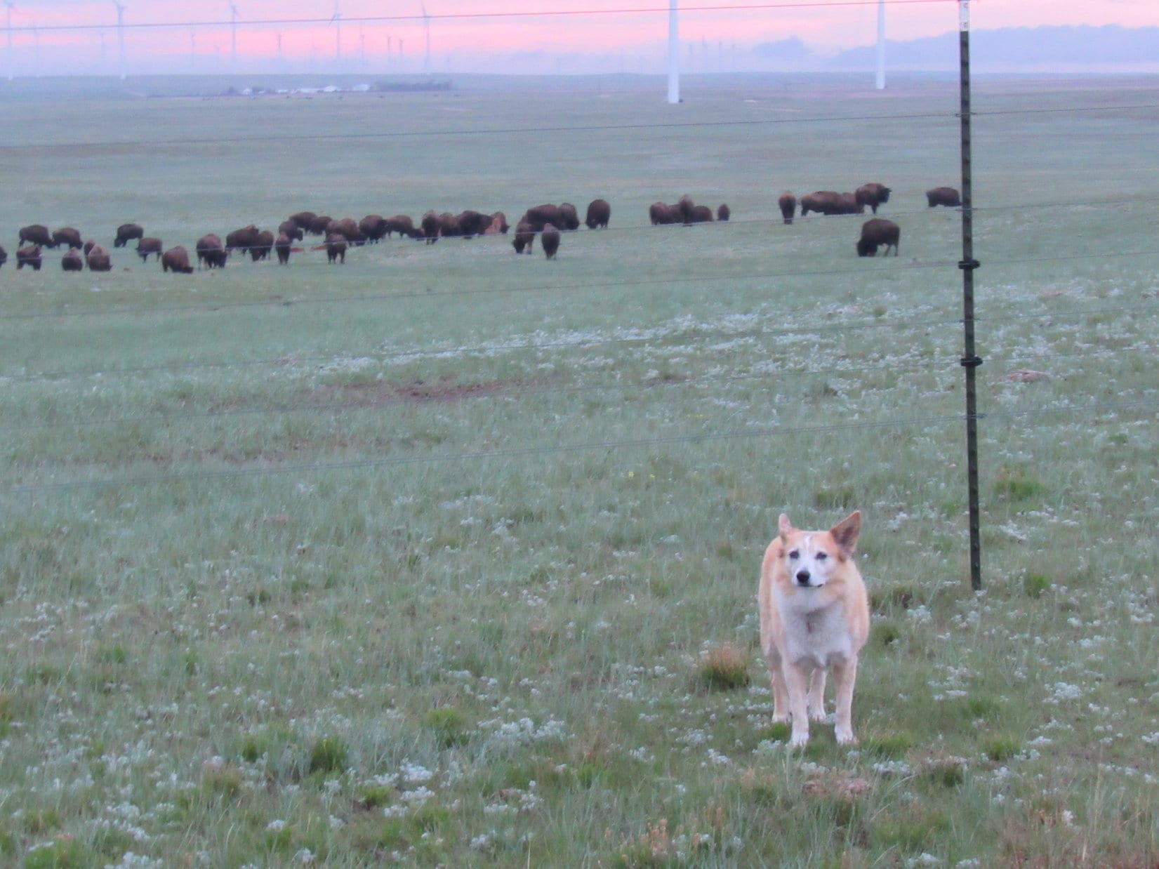 Standing cheerfully in a raw 20-25 mph E wind next to a big sign at the Nebraska state line, Lupe didn’t seem to realize what that meant yet. By the looks of the big grin on her face, the excited Carolina Dog was still eagerly anticipating all those glorious buffalo spread out across the Nebraska plains, a notion the sign greatly reinforced.