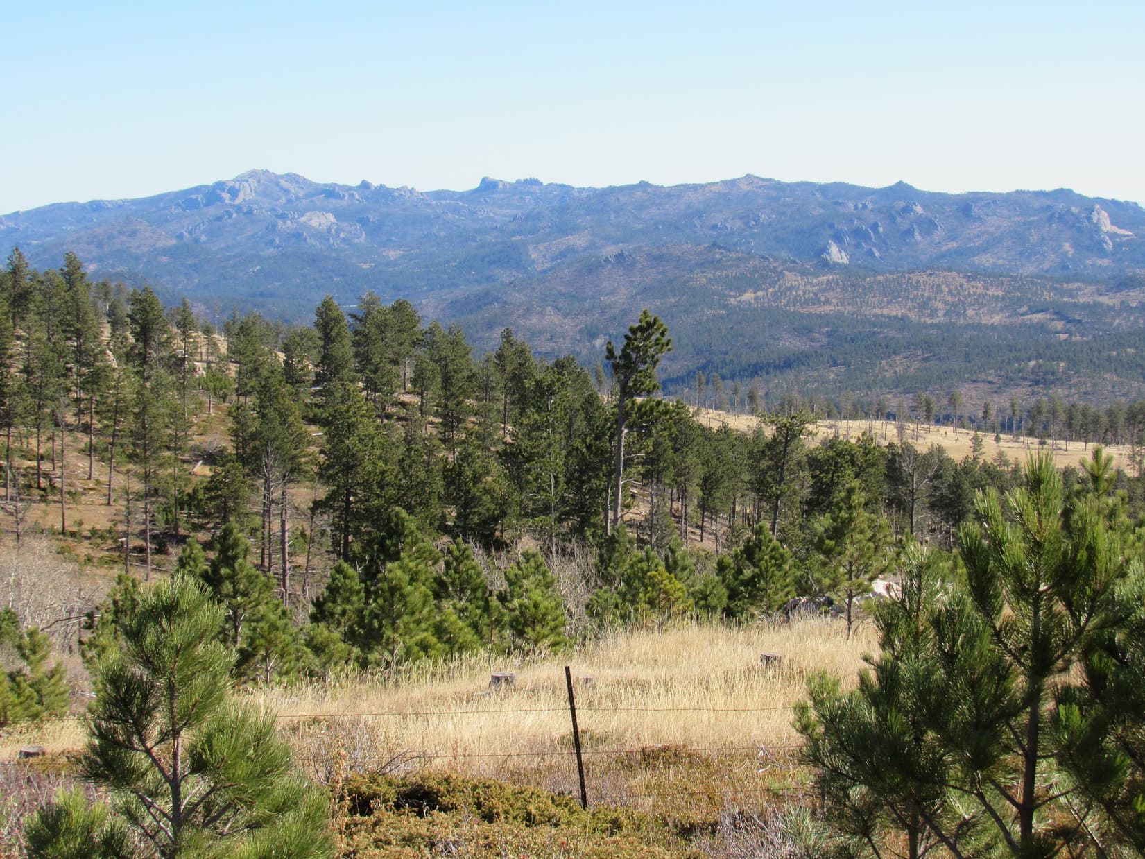 12:35 PM, Odakota Mountain (7,200 ft.) – Poor Odakota Mountain! South Dakota’s second highest peak was a mess. Surviving pines and a crop of new ones grew among what remained of a forest devastated by pine bark beetles 10 years ago. No views from the cairn, although both Bear Mountain (7,166 ft.) and a pond down by the old Boy Scout camp could be seen to the S from a little farther SW along the summit ridge.