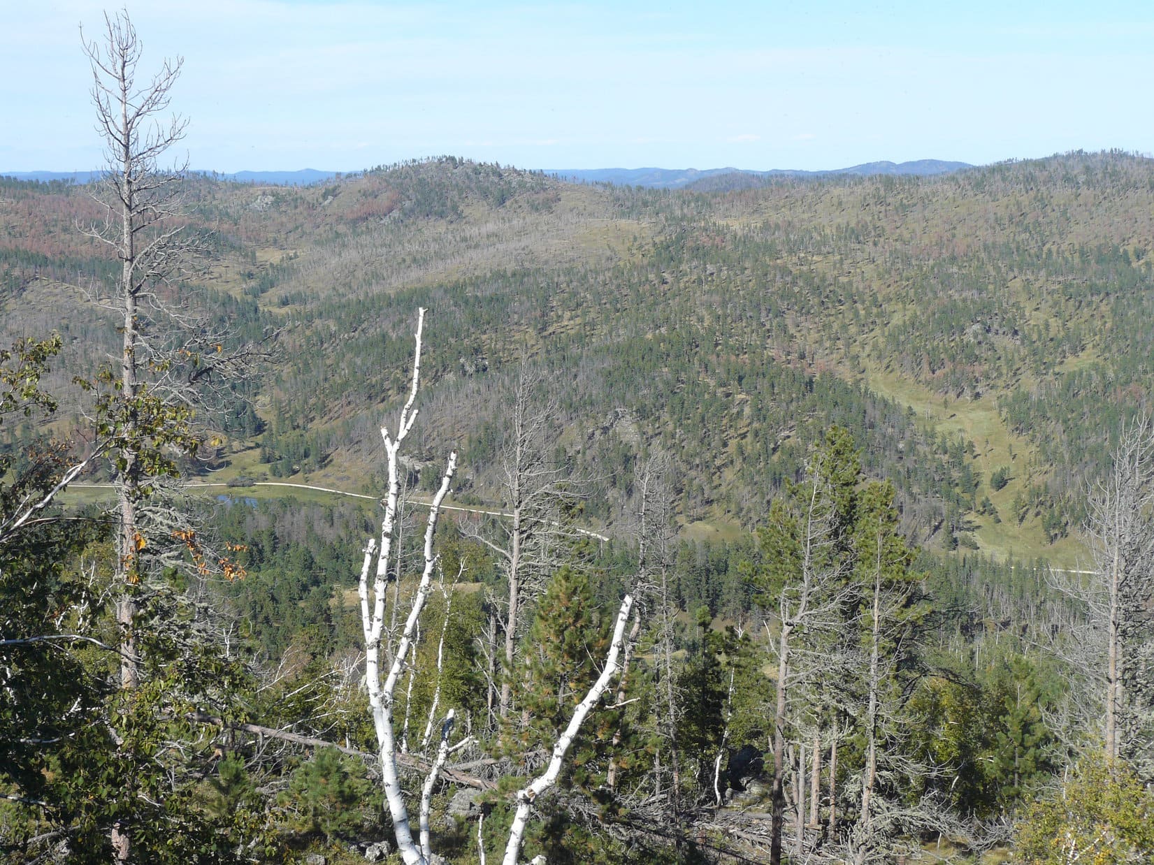 Finding a way across the marshy creek took a little while, but Lupe and SPHP managed to get across out into the main part of the valley again. The road had disappeared. The valley was full of tall grass and scattered stands of trees. Even though this was all Black Hills National Forest land, Lupe came to several barbed wire fences.