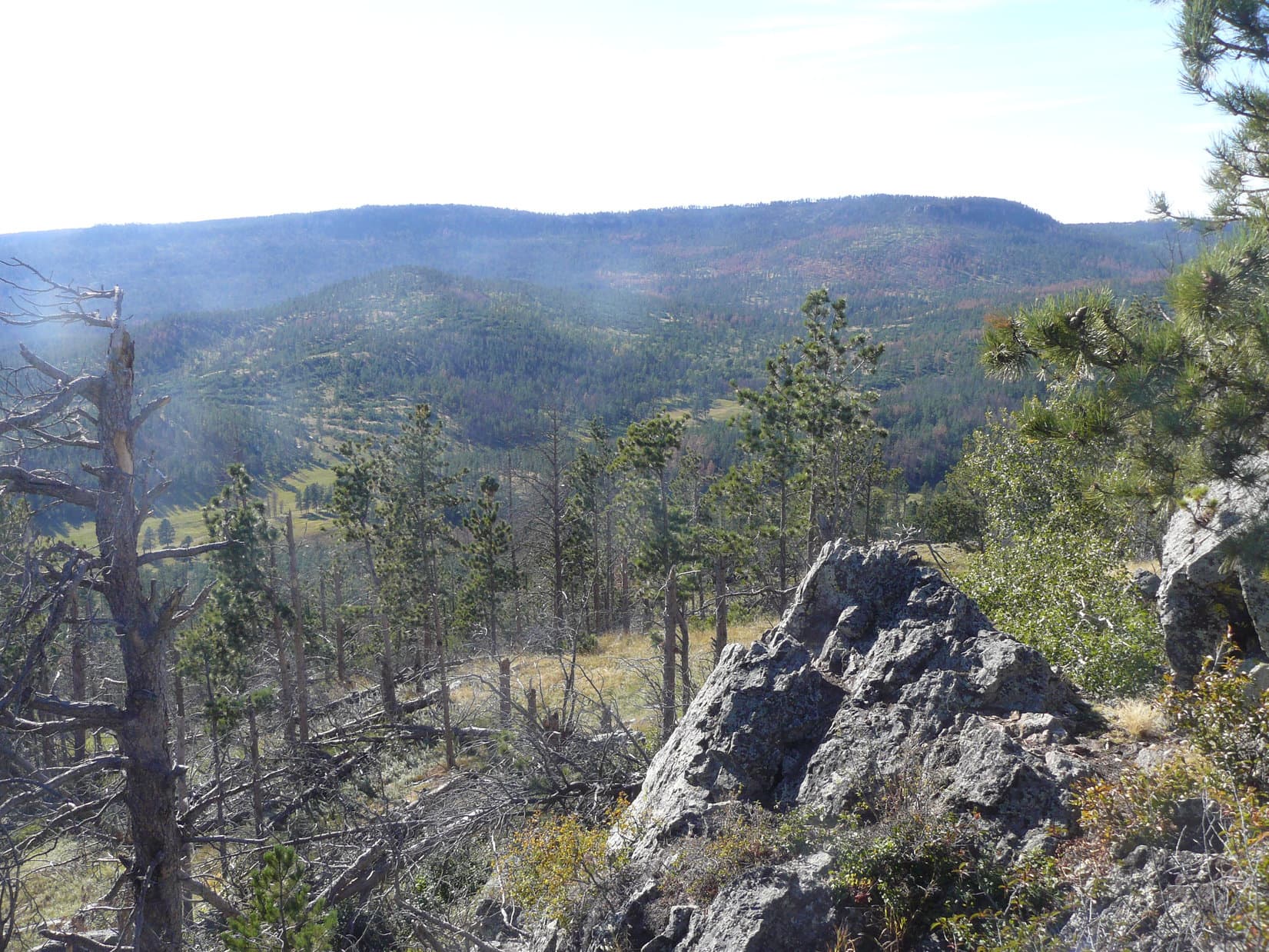 At the top of Peak 6720, Lupe found 3 separate high points strung out along the ridge. Each high point featured a rocky outcropping. The middle rock outcropping was the true summit, but fewer standing trees made the views better from the N and S high points.