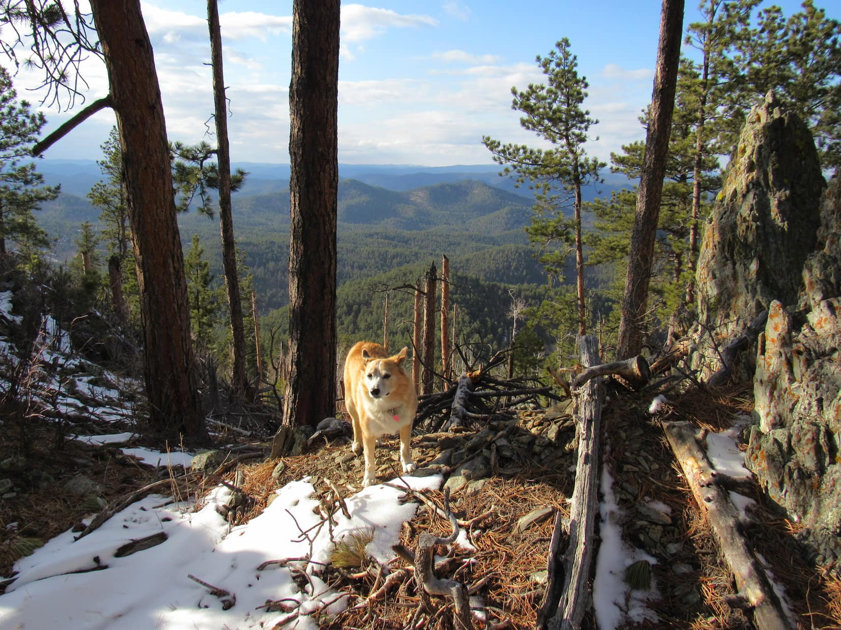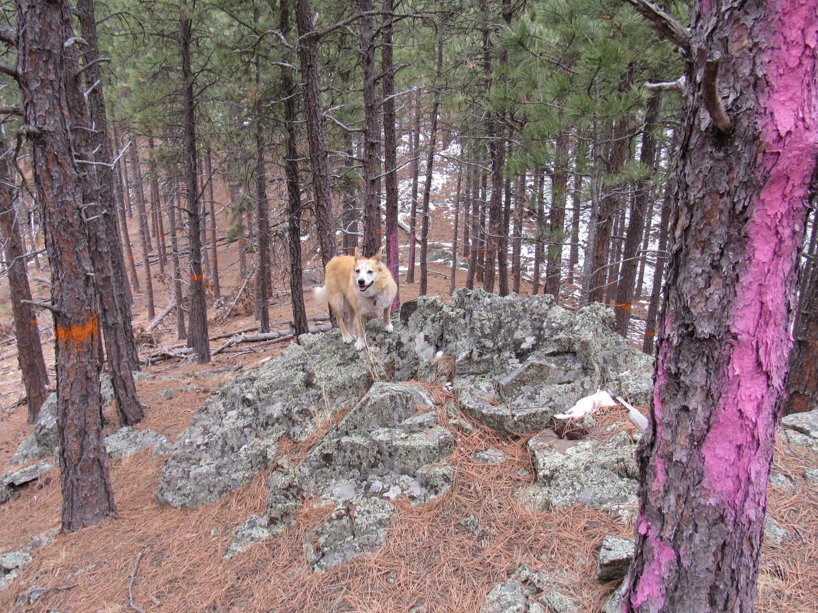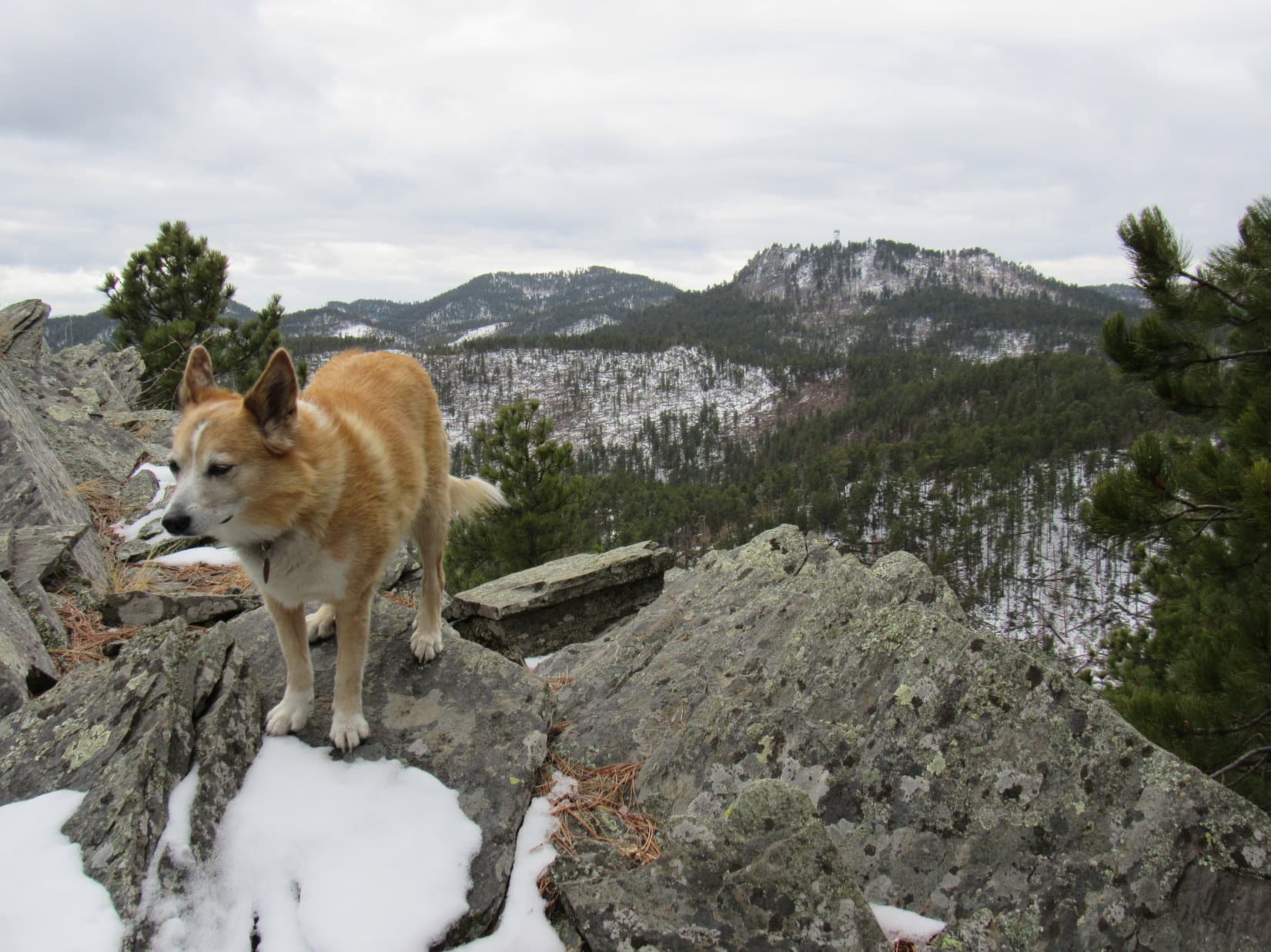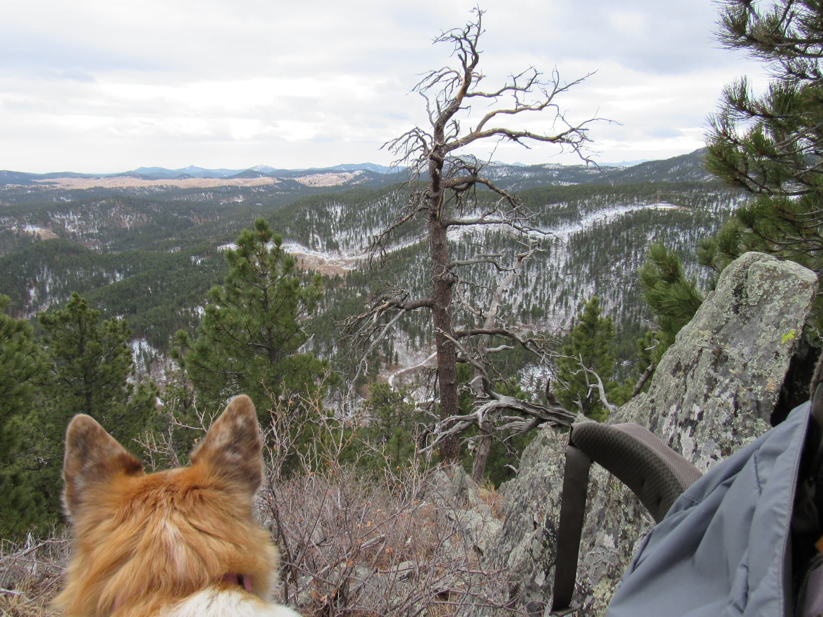 During 2025’s last sunny moments, Lupe conducted a final tour of the scenic highlights of New Year’s Eve Peak. The most open views were SE or S, where part of Sheridan Lake and many familiar mountains were on display. Boulder Hill (5,336 ft.), Silver Mountain (5,418 ft.), Calumet Ridge (5,615 ft.), Mount Warner (5,880 ft.), Black Elk Peak (7,231 ft.), Sylvan Peak (6,998 ft.), Five Points (6,228 ft.), and countless others. The Carolina Dog had visited all of them at least once upon a time.