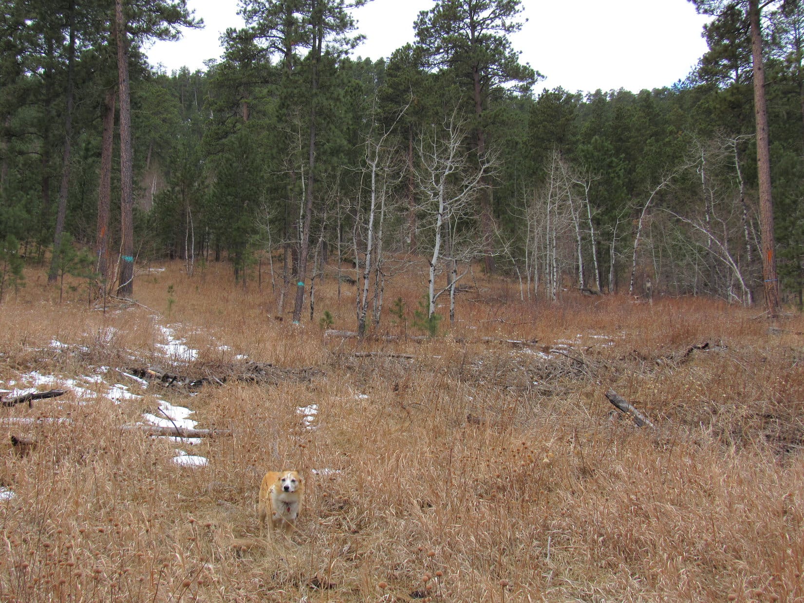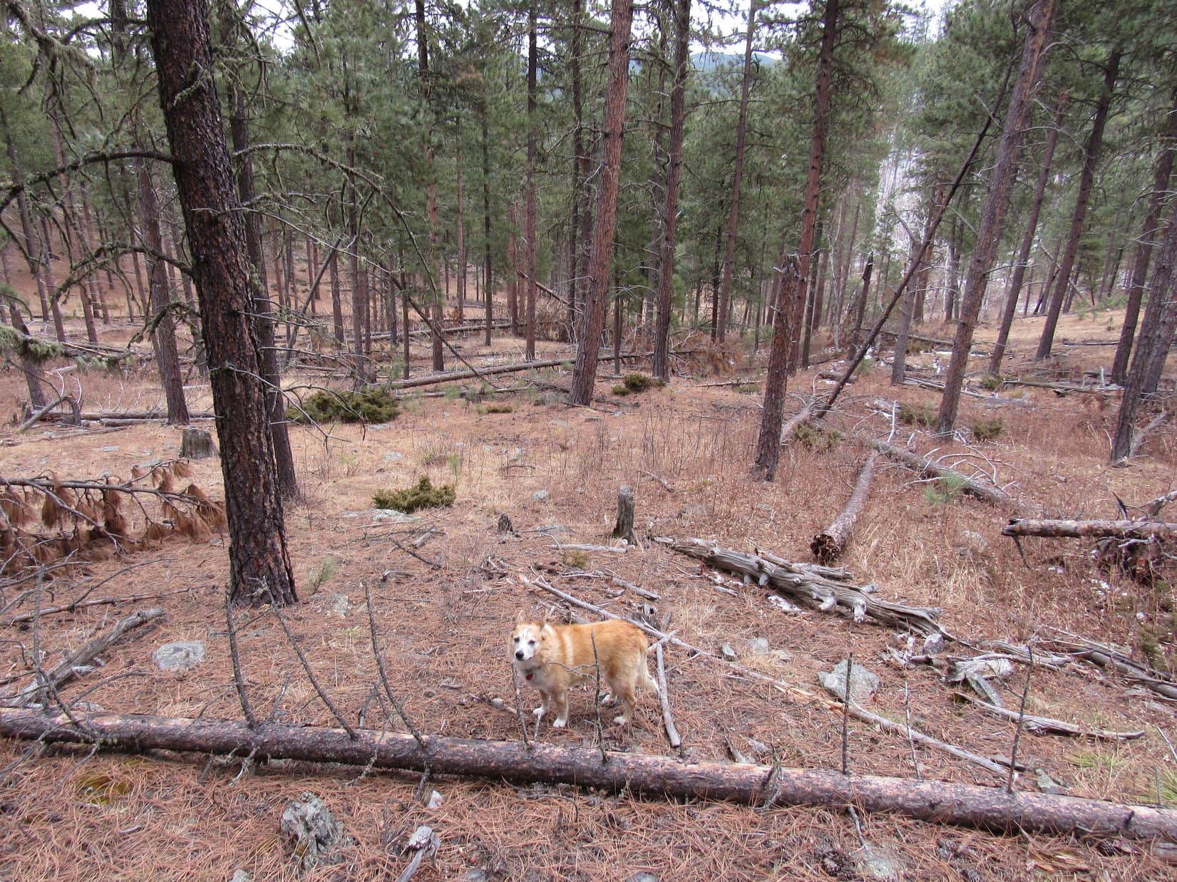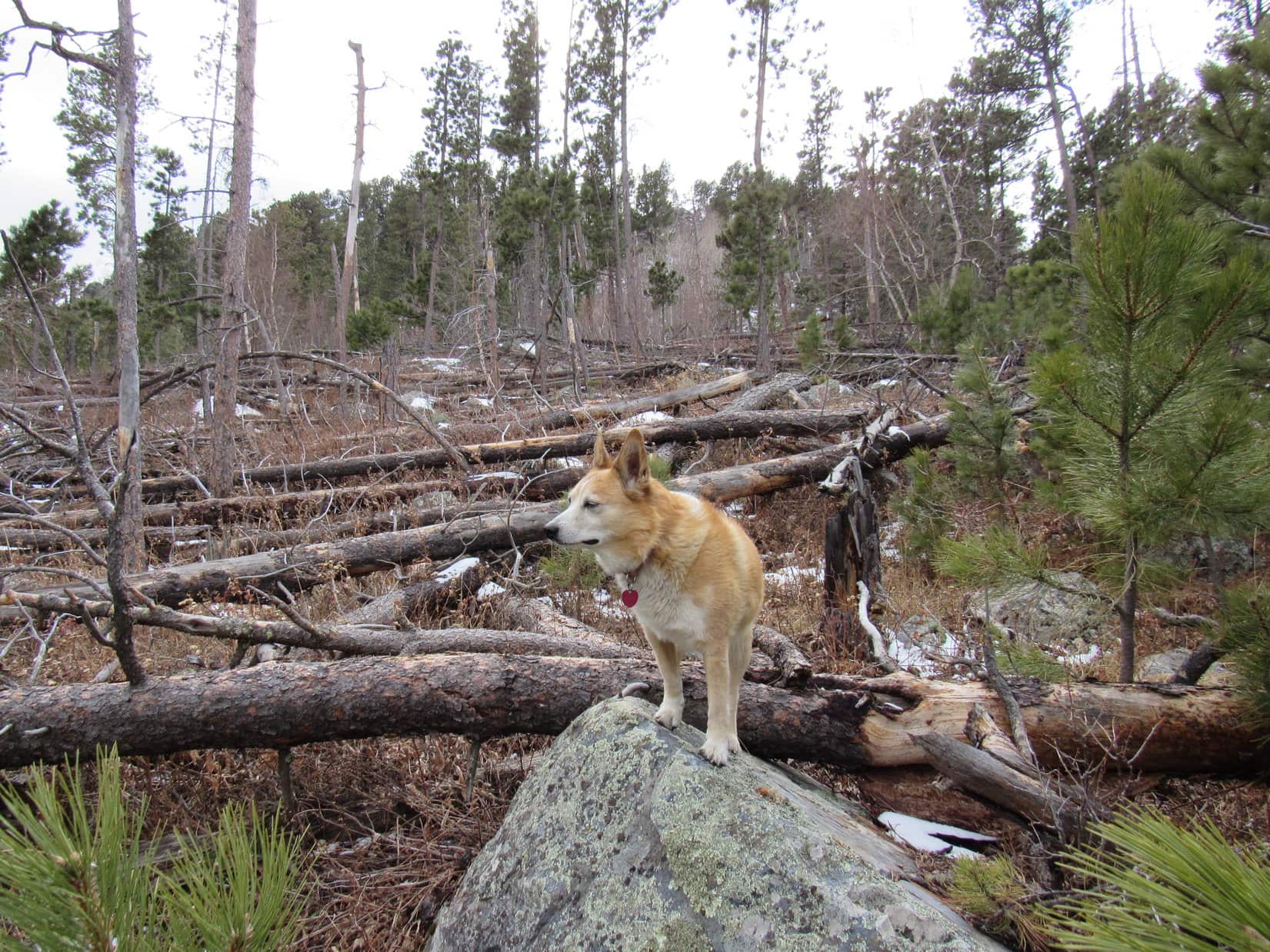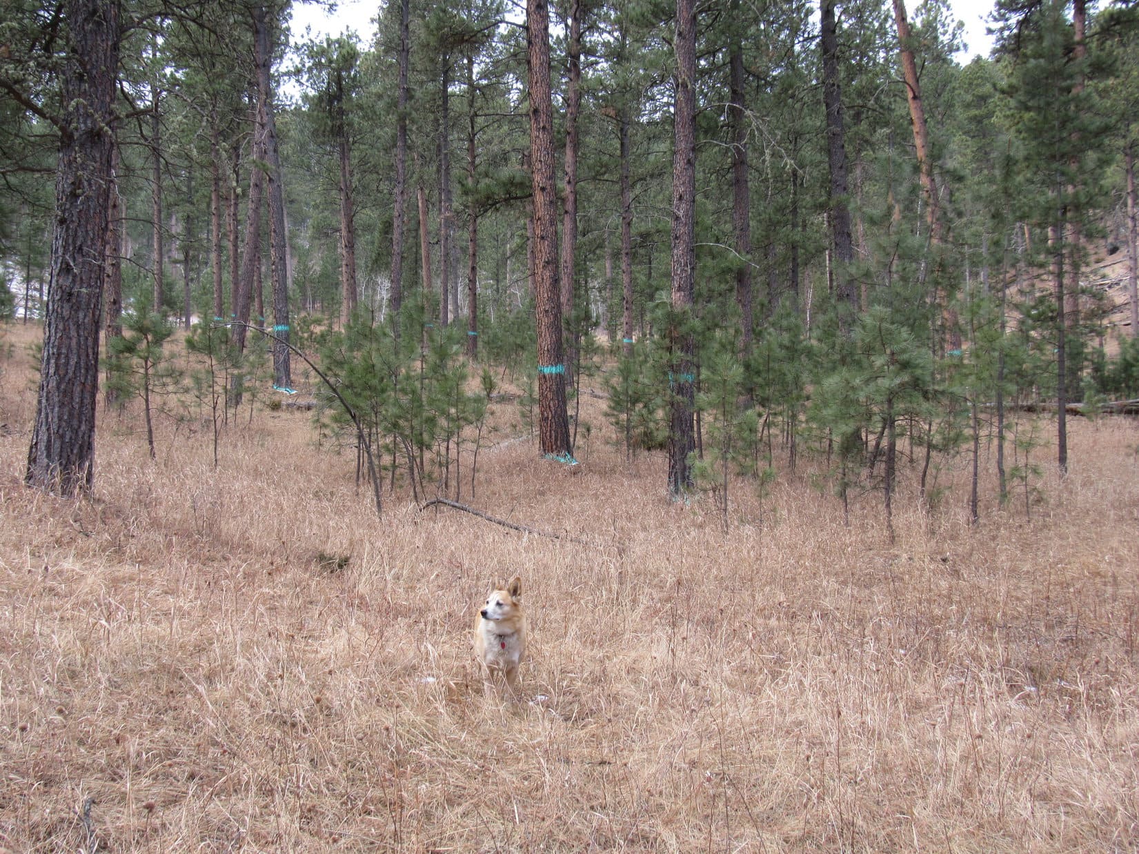 During 2025’s last sunny moments, Lupe conducted a final tour of the scenic highlights of New Year’s Eve Peak. The most open views were SE or S, where part of Sheridan Lake and many familiar mountains were on display. Boulder Hill (5,336 ft.), Silver Mountain (5,418 ft.), Calumet Ridge (5,615 ft.), Mount Warner (5,880 ft.), Black Elk Peak (7,231 ft.), Sylvan Peak (6,998 ft.), Five Points (6,228 ft.), and countless others. The Carolina Dog had visited all of them at least once upon a time.