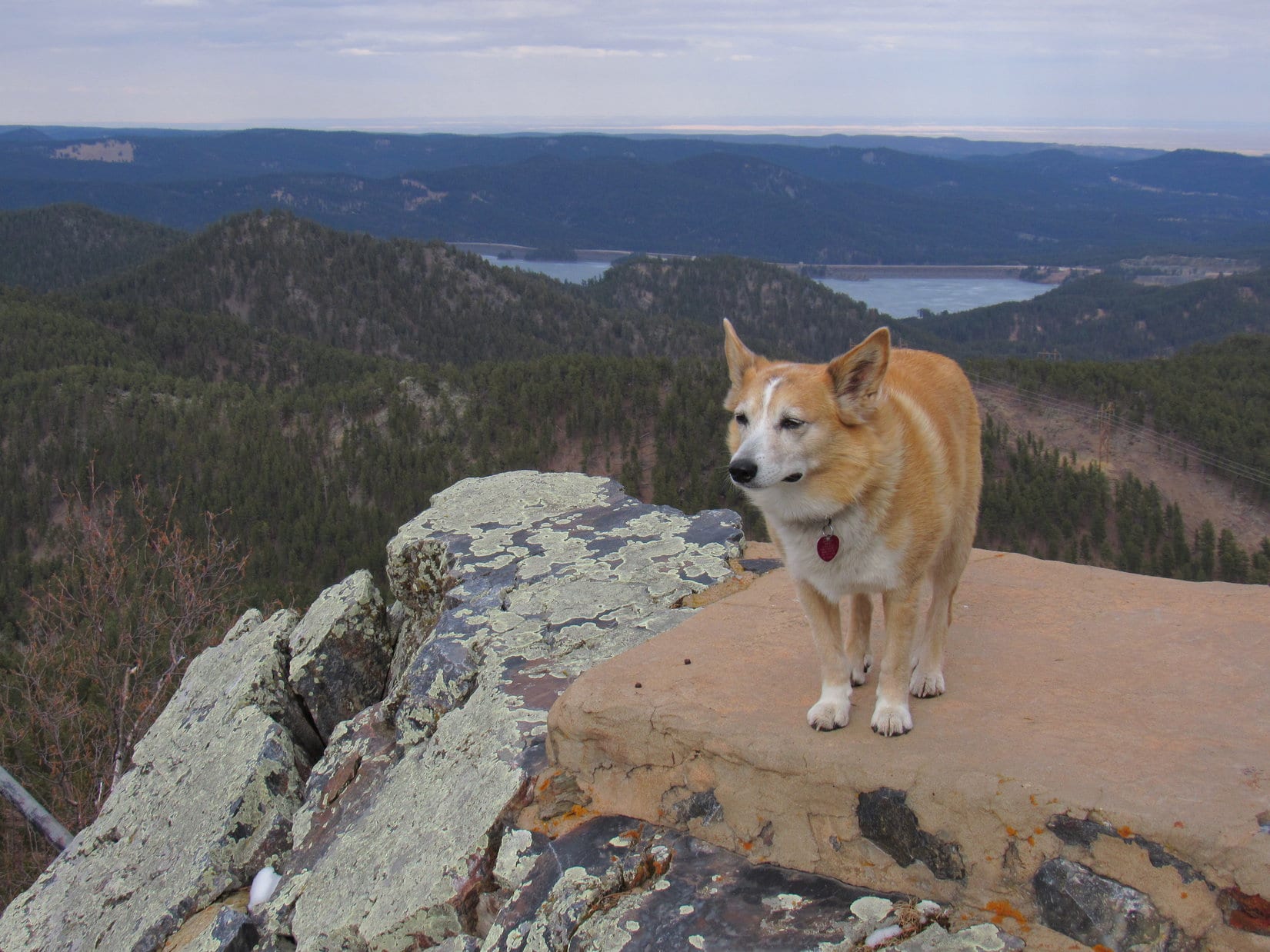 SPHP shared the requested chocolate coconut bar with Lupe, then gave her water and Taste of the Wild, too. The best views were of the lookout tower and the Pactola Reservoir dam. Moving around a bit, there were views in other directions, too.