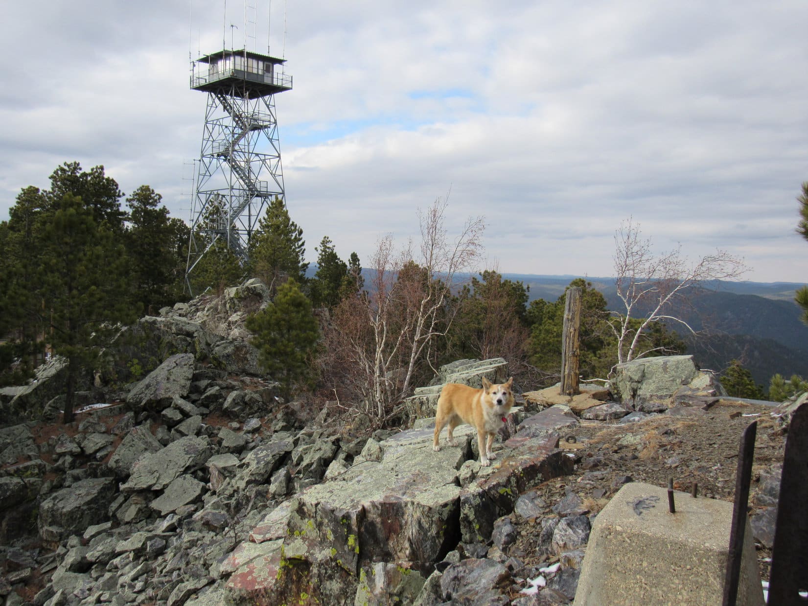 11:30 AM, 48ºF, Scruton Mountain (5,923 ft.) – The 50 foot long rocky summit ridge the American Dingo had reached must have once sported more facilities associated with the lookout tower. At the highest point, a few stone steps led to a small platform with nothing but a grand view of the Pactola Reservoir dam beyond it. This platform had evidently been built on, or right next to, Scruton Mountain’s true summit.