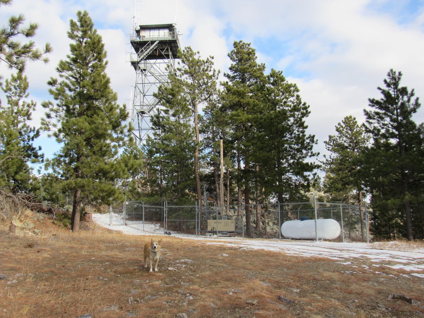No. 156 soon led up into the forest. Not much in the way of views here, but still a pleasant, easy trek. Before long, Lupe was approaching the old Seth Bullock fire lookout tower.
